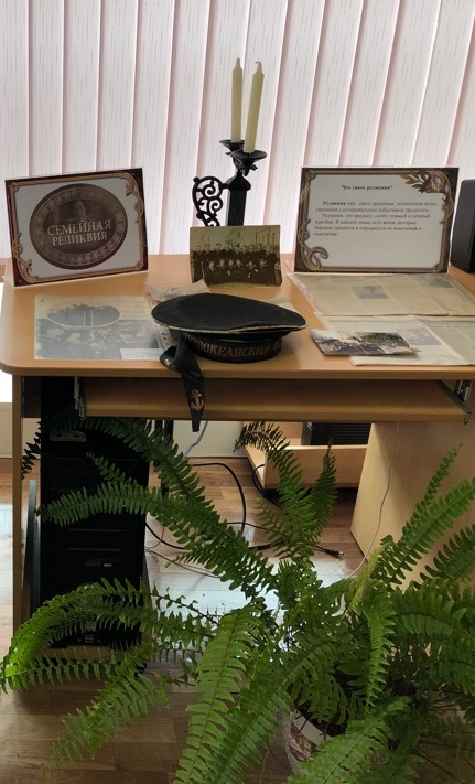 На выставке представлены материалы из семейных архивов жителей поселка. В настоящее время можно познакомиться с реликвией семьи Шалыгиных – бескозыркой, фотографиями, и вырезками из газет и журналов. Выставка посвящена Виталию Алексеевичу Шалыгину, моряку – подводнику Тихоокеанского флота. Он служил на дизельной субмарине С-145, совершившей самое первое длительное погружение в истории подводного Российского флота.