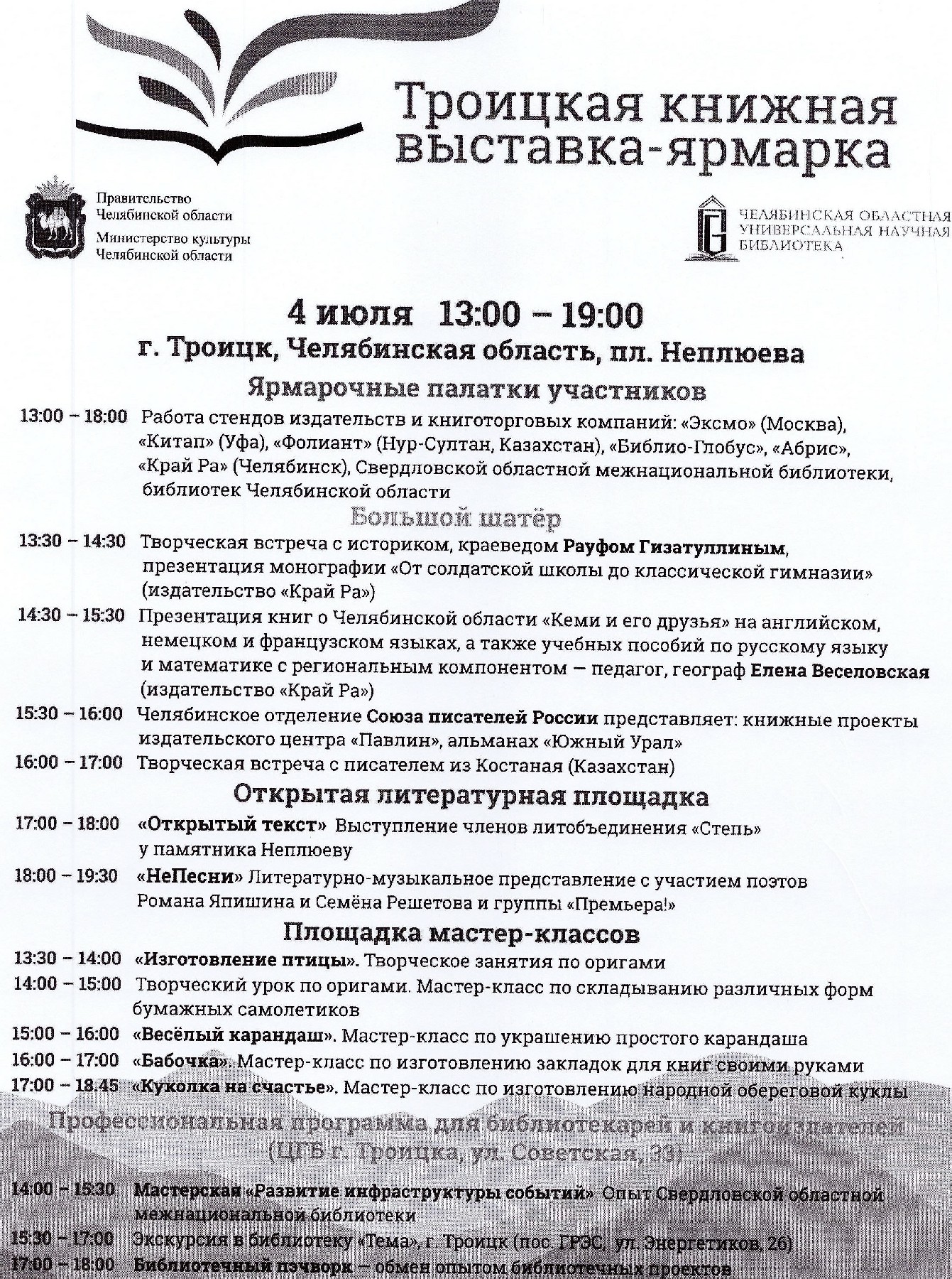 4-5 июля 2019 года в городе Троицке Челябинской области на площади Неплюева впервые пройдёт Троицкая книжная выставка-ярмарка.