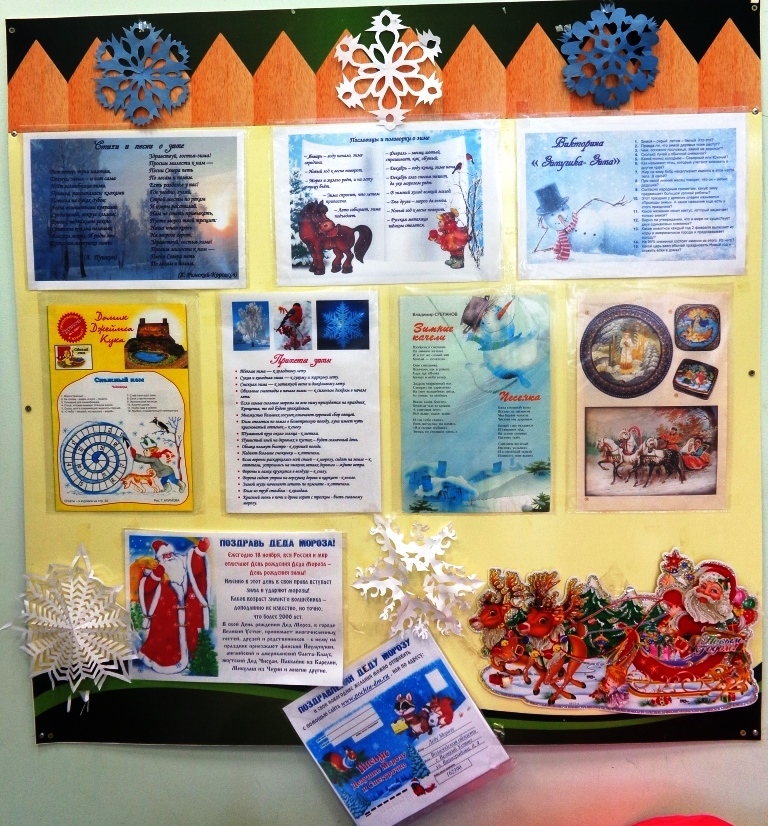 К Новогодним праздникам оформлены выставки «Зимушка-зима», «Новогодняя сказка», «Новый год», информационный стенд «Поздравь Деда Мороза».