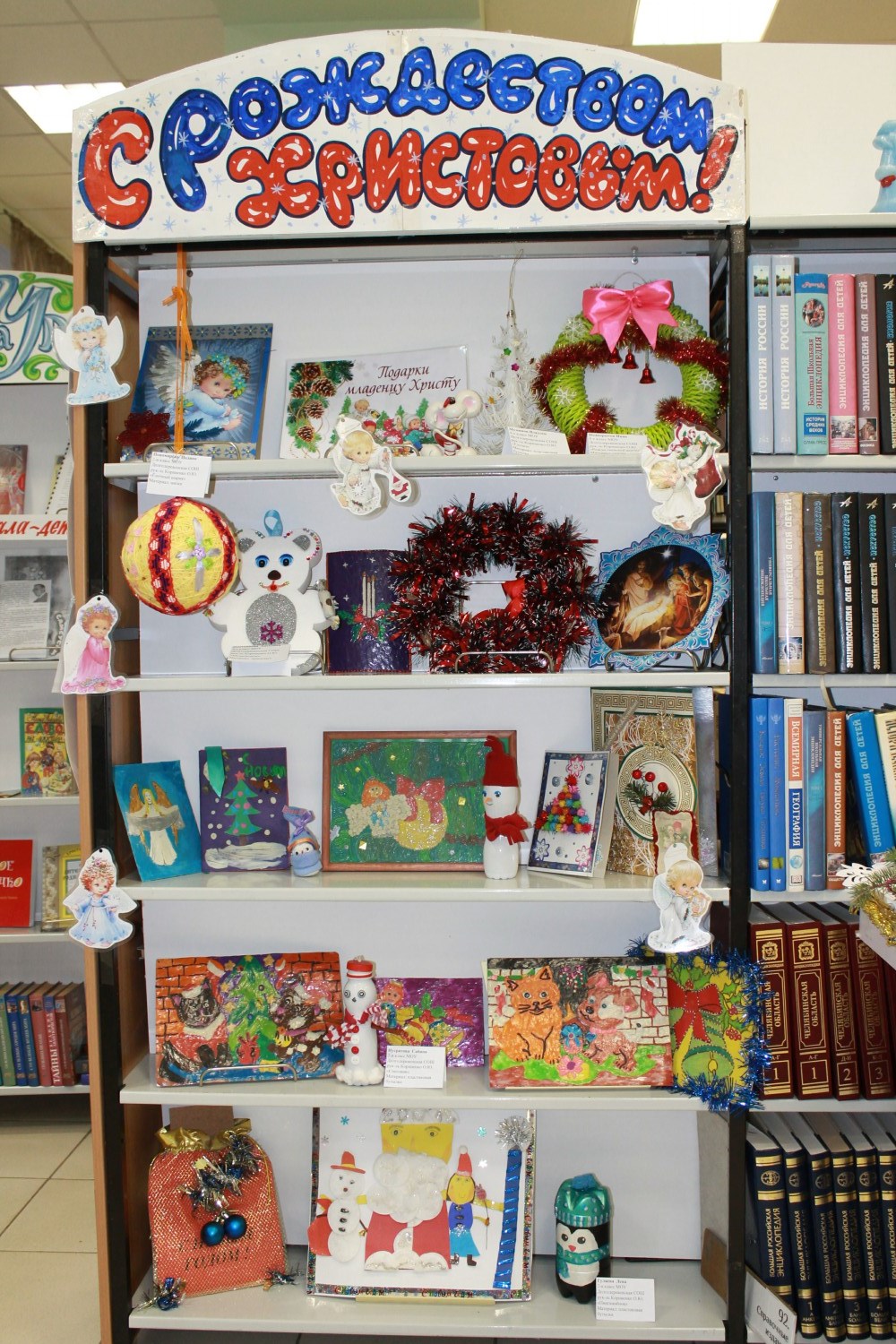 В преддверии новогодних праздников интерьер детской библиотеки украсили информационный стенд, и выставка книг «Пока часы двенадцать бьют» и с «С Новым годом!», выставка творческих работ «С Рождеством», Елка пожеланий, на которую каждый может поместить свой шарик или оставить свою бумажную ладошку с пожеланиями.