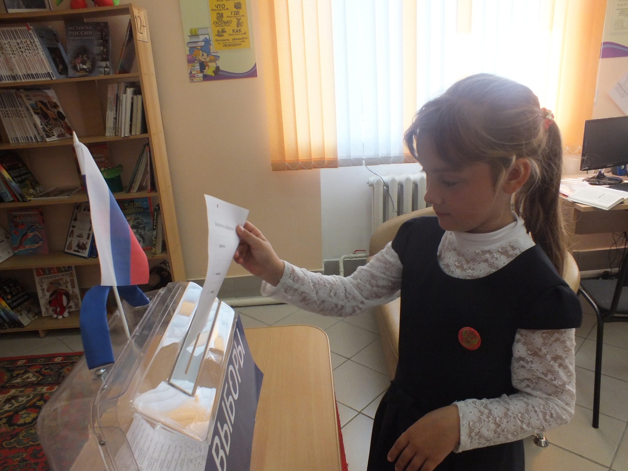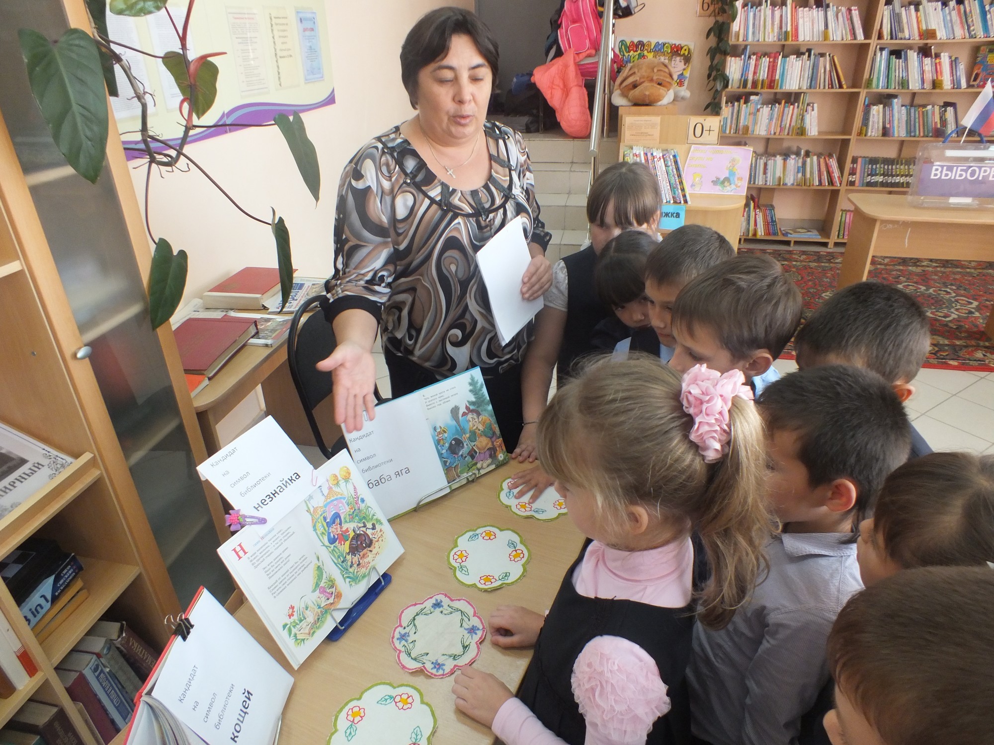На урок были приглашены учащиеся 2 класса Мирненской СОШ. Для начала, школьники вместе с маленькими человечками отправились узнавать, что же такое выборы и зачем они нужны. Затем в библиотеке состоялись настоящие выборы. На главный символ библиотеки претендовали 3 кандидата: Баба Яга, Незнайка и Кощей Бессмертный. После того как библиотекарь познакомила ребят с каждым кандидатом и с их предвыборной кампанией (прочитав отрывок из сказки), ребята приступили к голосованию. Сколько было переживаний, когда вскрыли ящик для подсчета голосов и сколько радости, не передать.