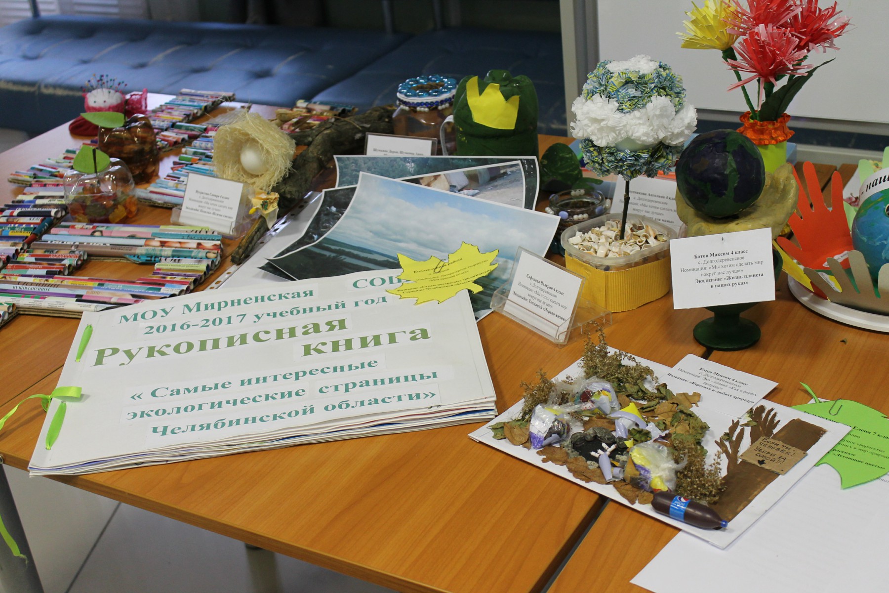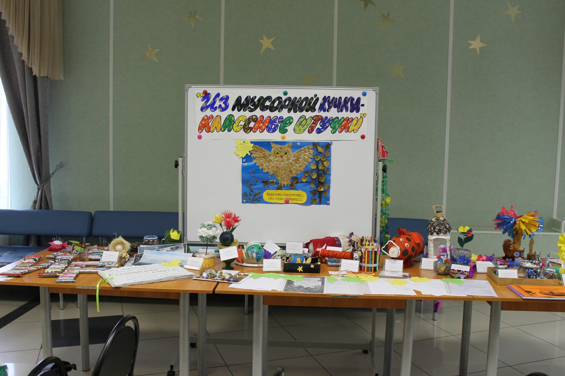 Гостям праздника продемонстрировали лучшие поделки и плакаты участников конкурса, представленные на стендах и выставках «Из мусорной кучки классные штучки», «Как я берегу природу».