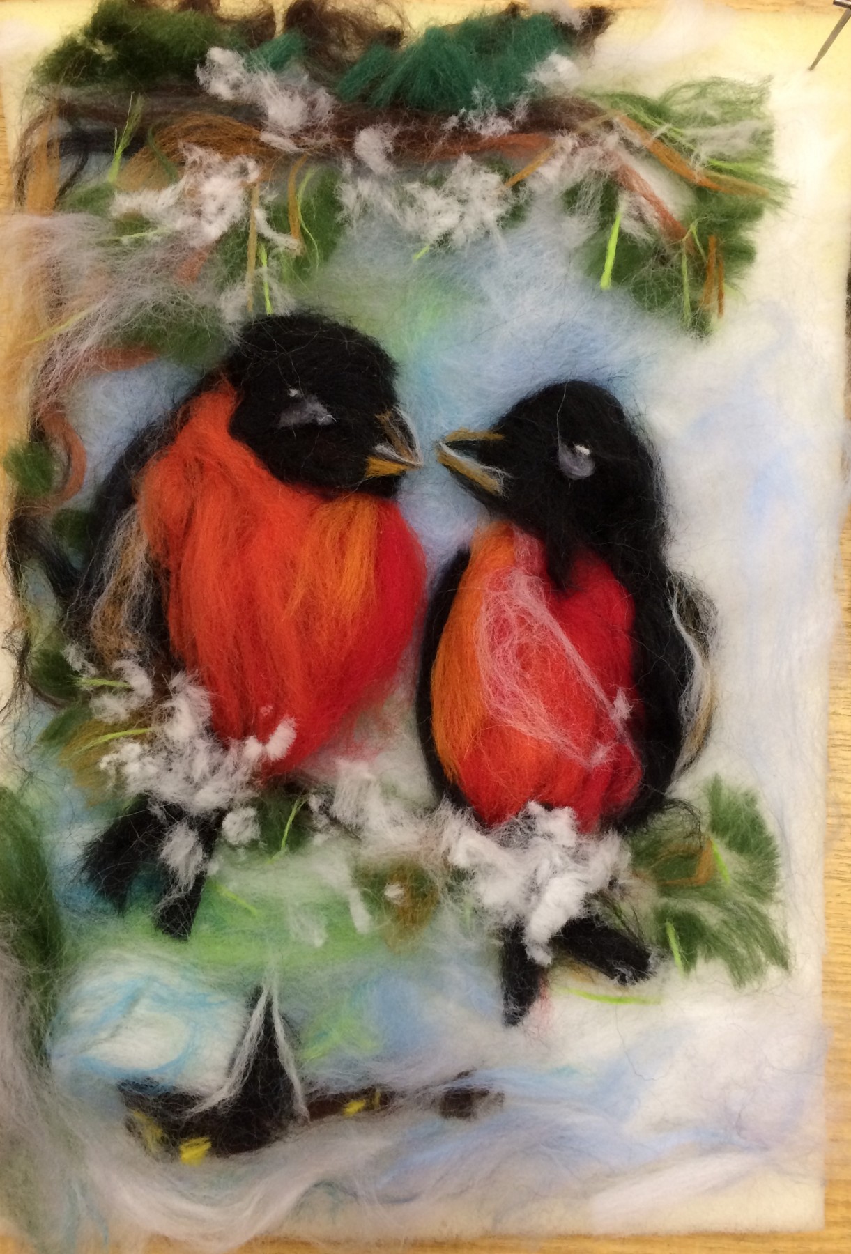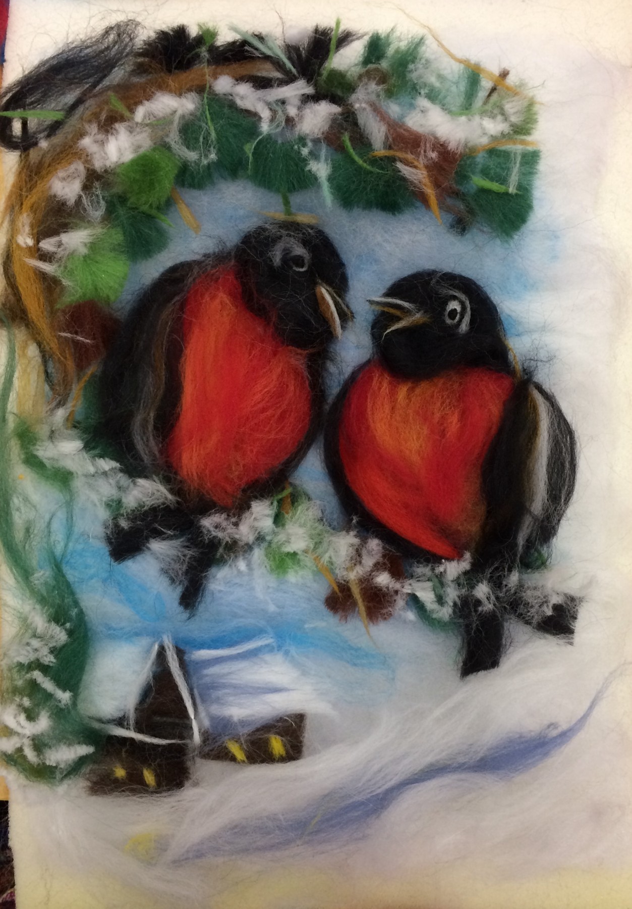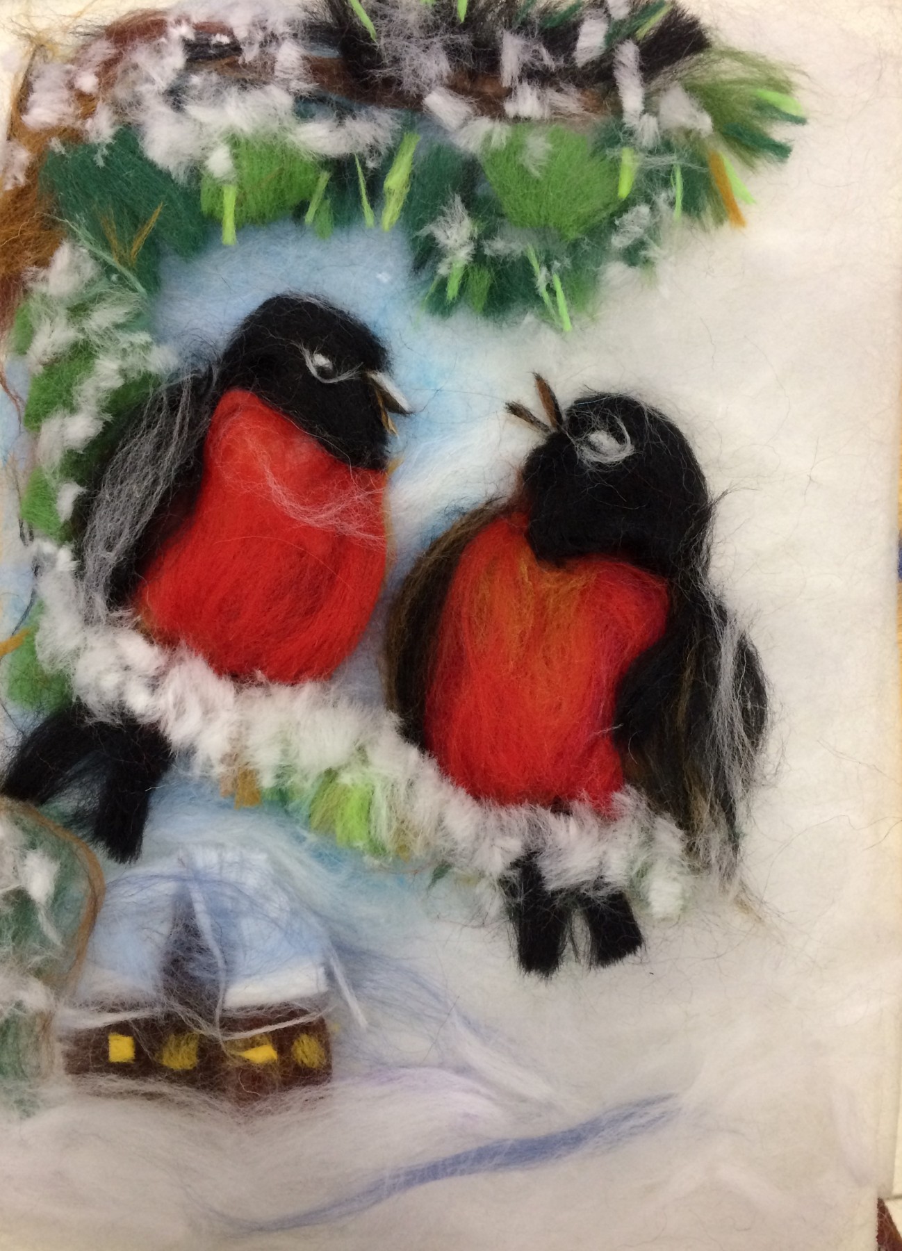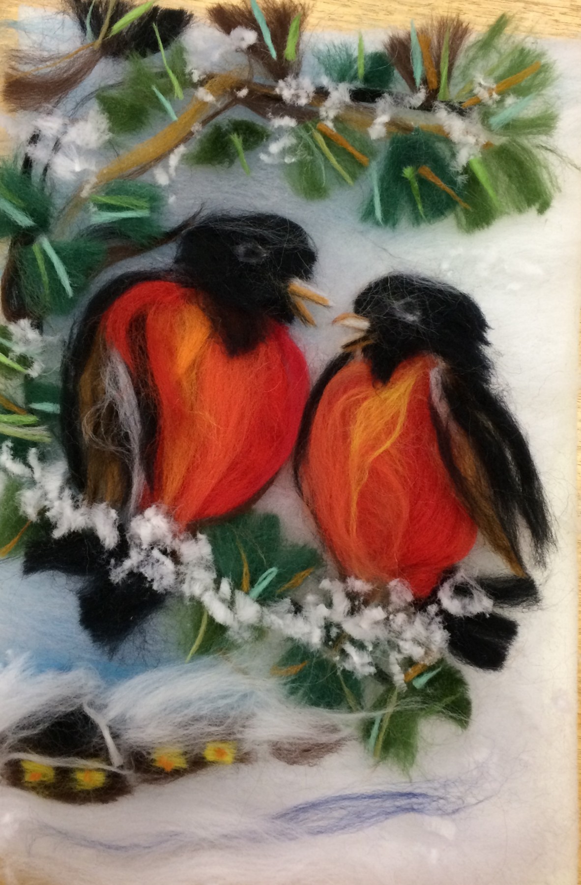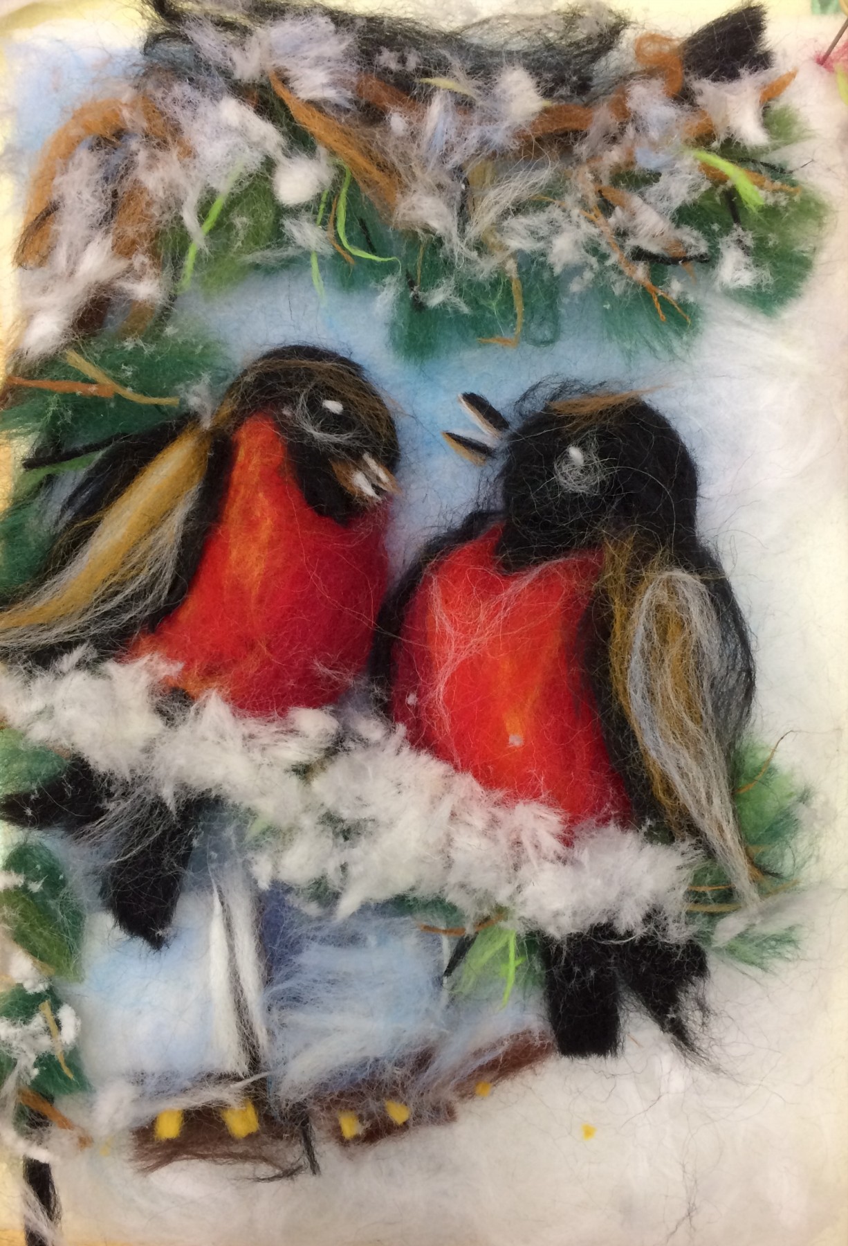 Участницы с вдохновением рисовали шерстью прекрасный зимний пейзаж со снегирями, создавая новогоднее настроение. Работы получили отличную оценку мастера Елены Бухтояровой: «Все участницы – молодцы! Справились не только с очень сложной по технике работой, но, самое главное – у вас получилось создать живые, разумные, и такие разные по характеру образы! А это ведь простые птахи! Горжусь вами! С наступающим Новым годом!».