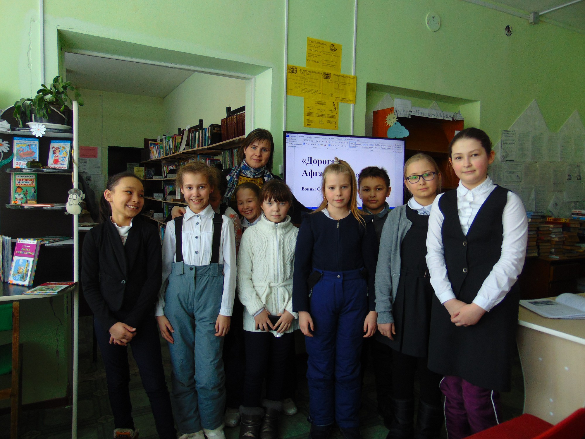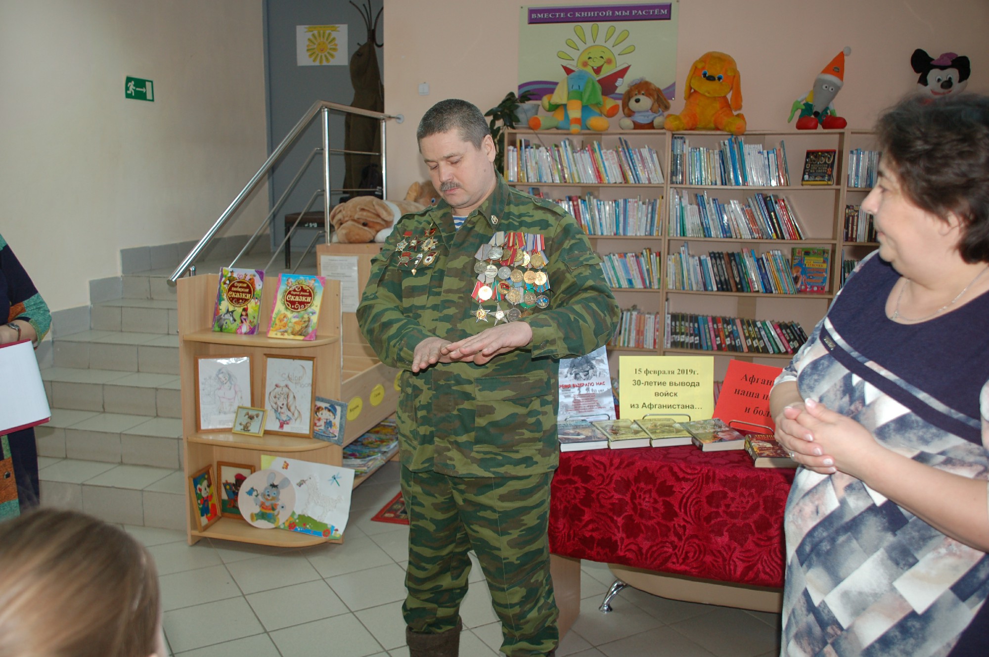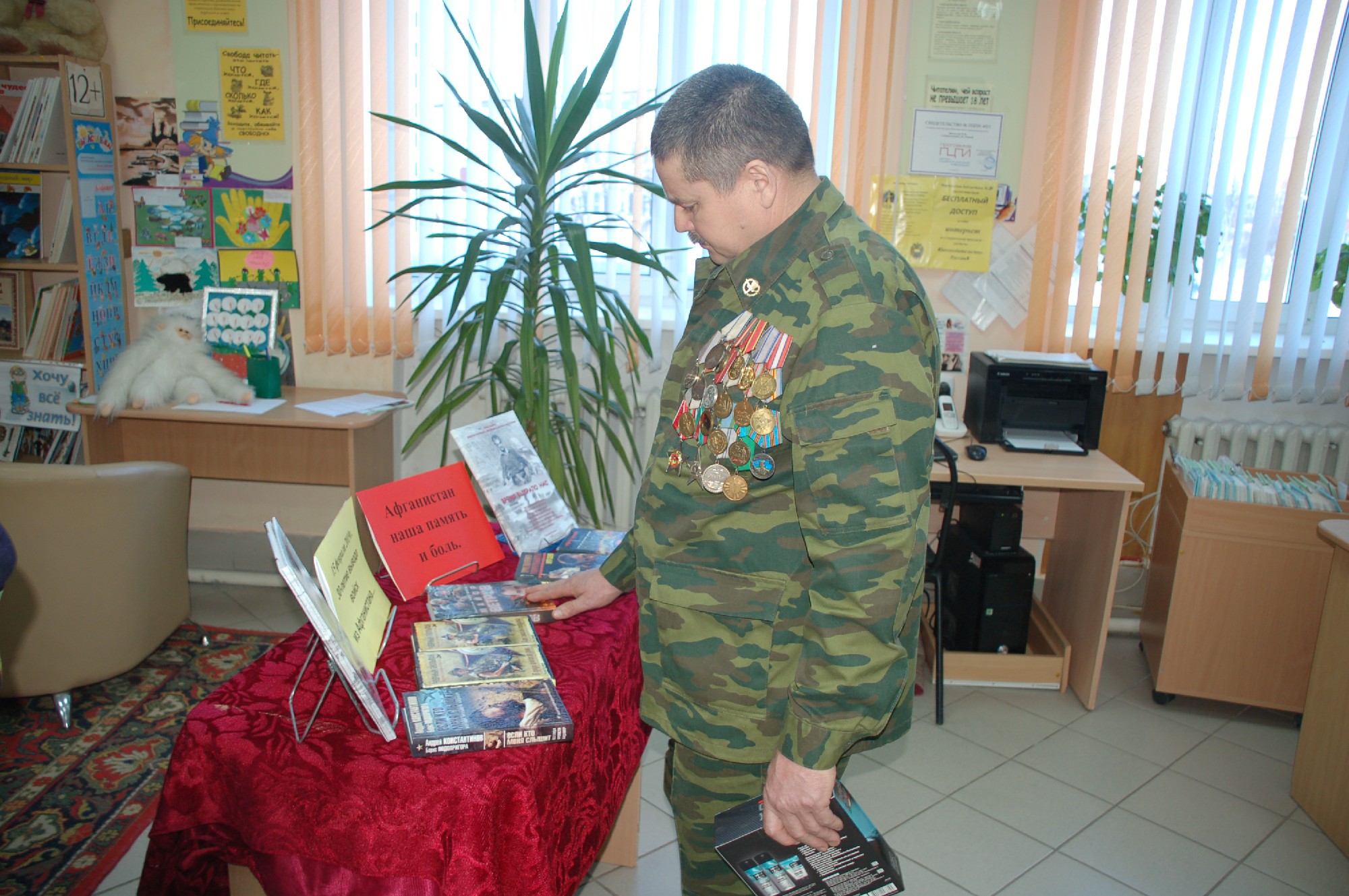 Среди жителей поселка есть участники боевых действий в Афганистане. Один из них, Шалыгин Алексей Витальевич, был гостем библиотеки в этот день. Алексей поделился воспоминаниями о службе в Афганистане, рассказал, что лучшим другом его на войне была собака Дик, которая вместе с ним несла службу.