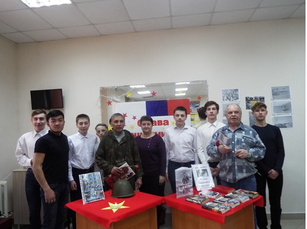 Школьники также подготовились к мероприятию, рассказали стихи, посвященные мужеству наших солдат, всем тем, кто служил в горячих точках, исполняя свой воинский долг. Валеева Элина рассказала о своем дяде Галине Рамиле, который служил в Чечне и вернулся с осколком железа в груди. Мероприятие закончилось минутой молчания, почтили память солдат погибших в Афганской и Чеченской войнах.