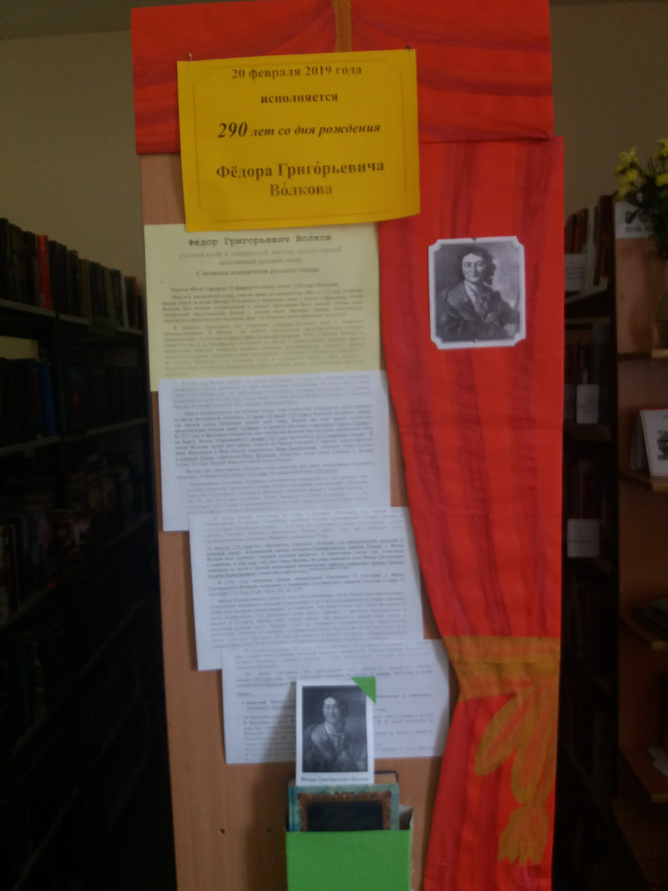 Отдельный раздел выставки посвящен Федору Григорьевичу Волкову – русскому актёру и театральному деятелю, создателю первого постоянного русского театра.