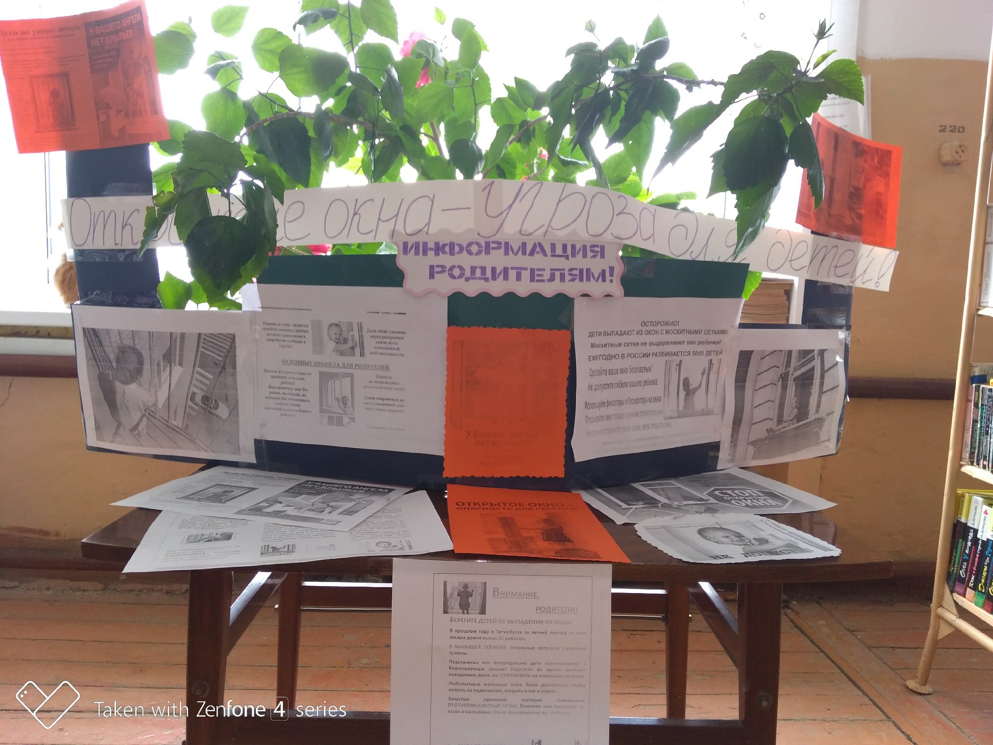 В библиотеке Касарги 20 мая 2019 года был оформлен информационный стенд «Осторожно! «Открытое окно и дети». На абонементе была размещена печатная продукция профилактического характера буклеты памятка для родителей «Как предотвратить выпадение ребёнка из окна», «Осторожно: открытое окно и дети», все родители, имеющих маленьких детей, знакомились с ней при посещении библиотеки. Также был проведён урок безопасности «Ты один дома» с воспитанниками детского сада, со школьниками 1 и 4 классов. Дети внимательно слушали о том, какие им, надо соблюдать меры безопасности, чтобы предотвратить беду: не подходить к открытым окнам, не подставлять к открытому окну предметы мебели и не залазить на подоконник, и др. Для закрепления материала провели викторину «Знатоки безопасного поведения».