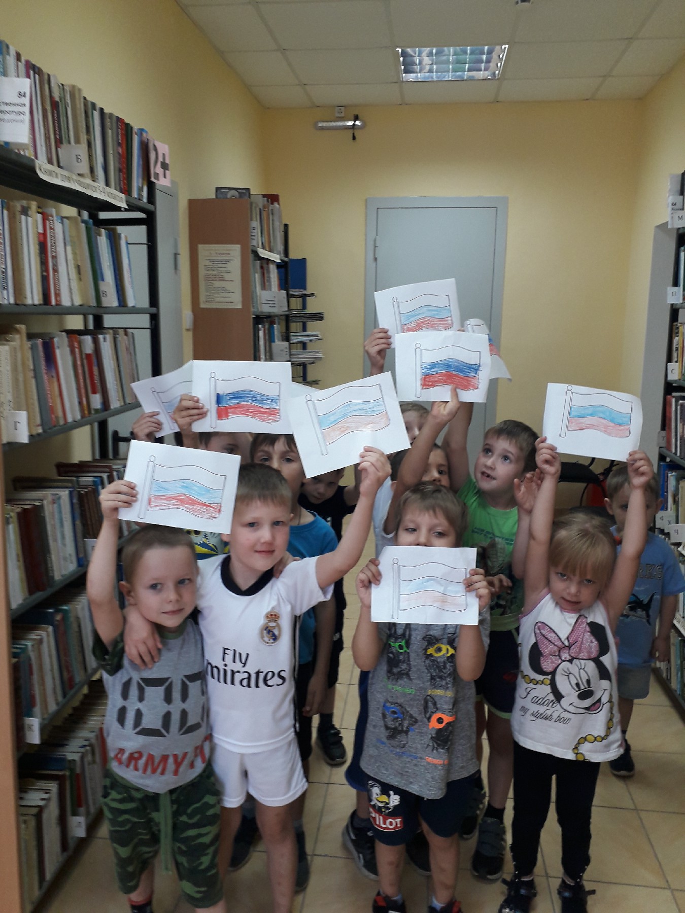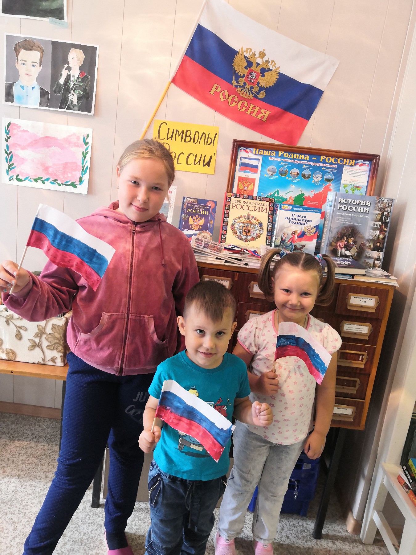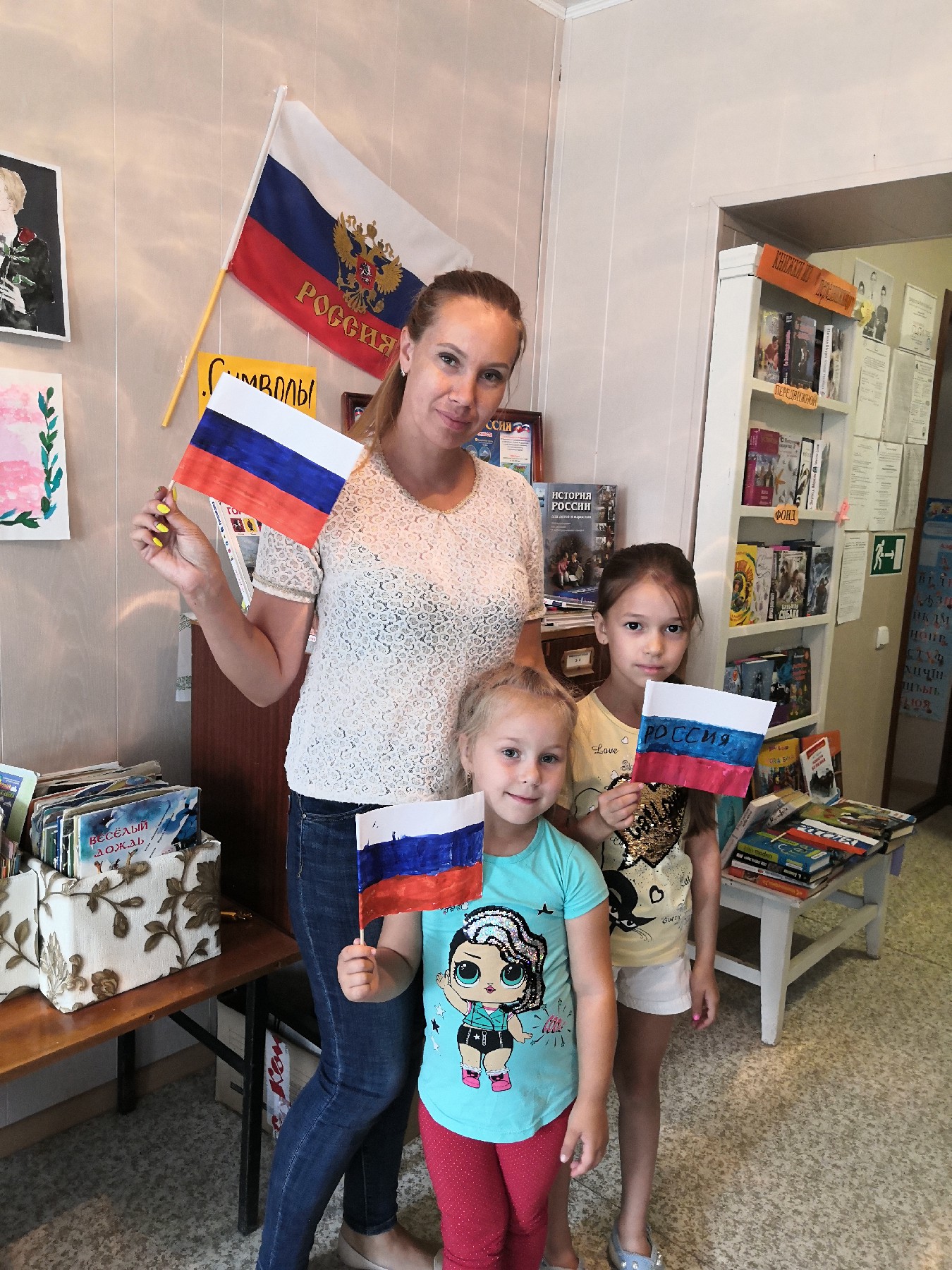 Библиотекарь Юлия Валеева познакомила ребят с историей возникновения и утверждения флага, как одного из символов государства российского, о том, что символизирует каждый цвет флага. Они узнали о том, что в каждой стране существует триединство символов: герб, флаг, гимн.