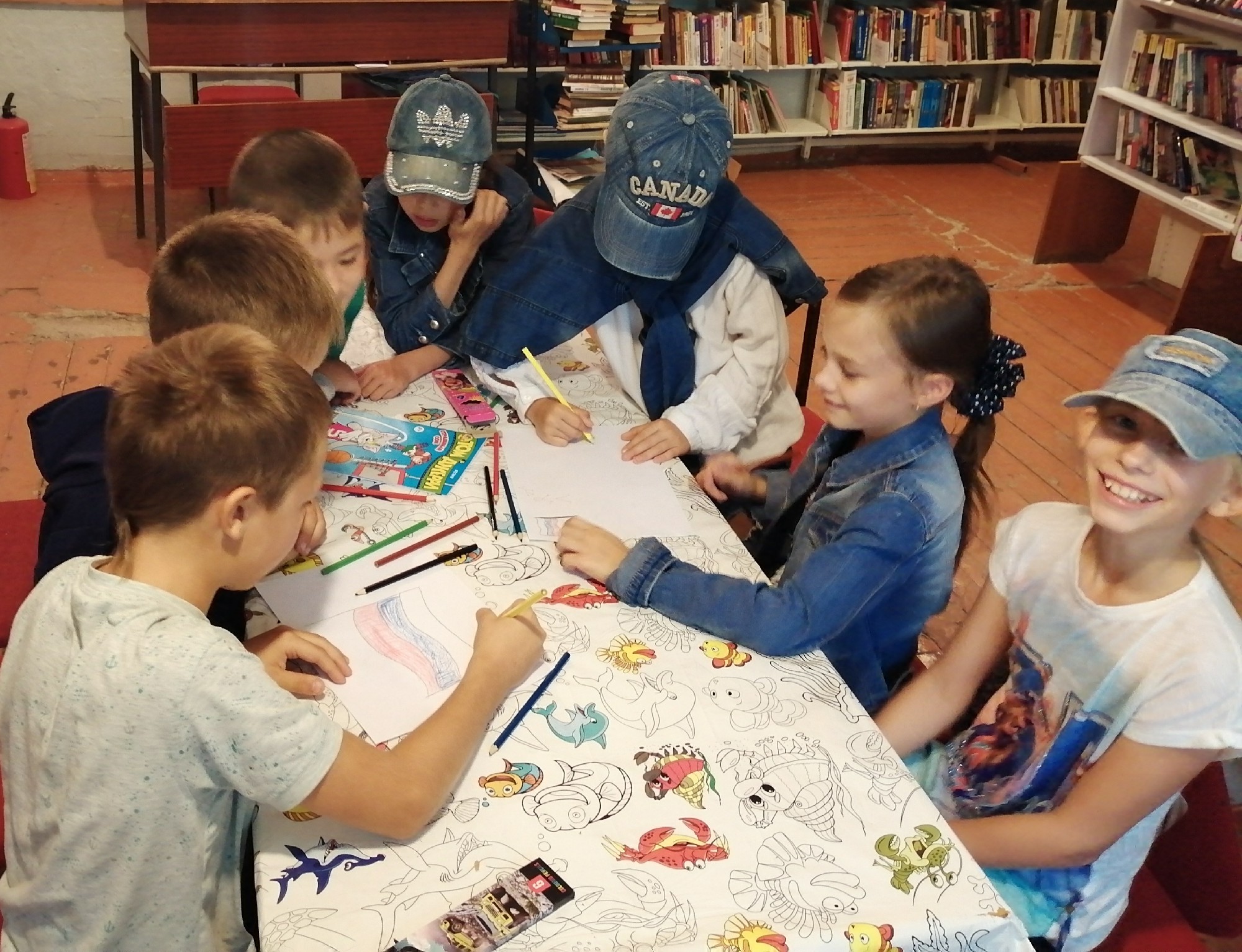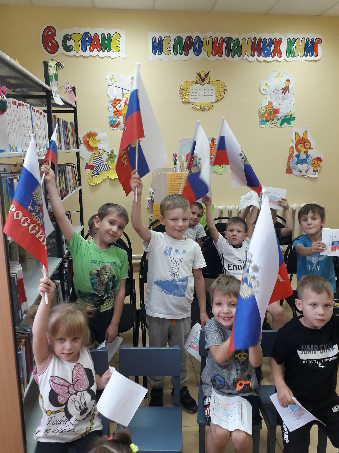 Ребята задержались возле выставки «Во славу Российского флага». Дальше переместились в зал, где с интересом посмотрели мультфильм «Флаг России», после которого, библиотекари рассказали интересные факты об истории создания и значении цвета, о гербе и гимне нашей страны.