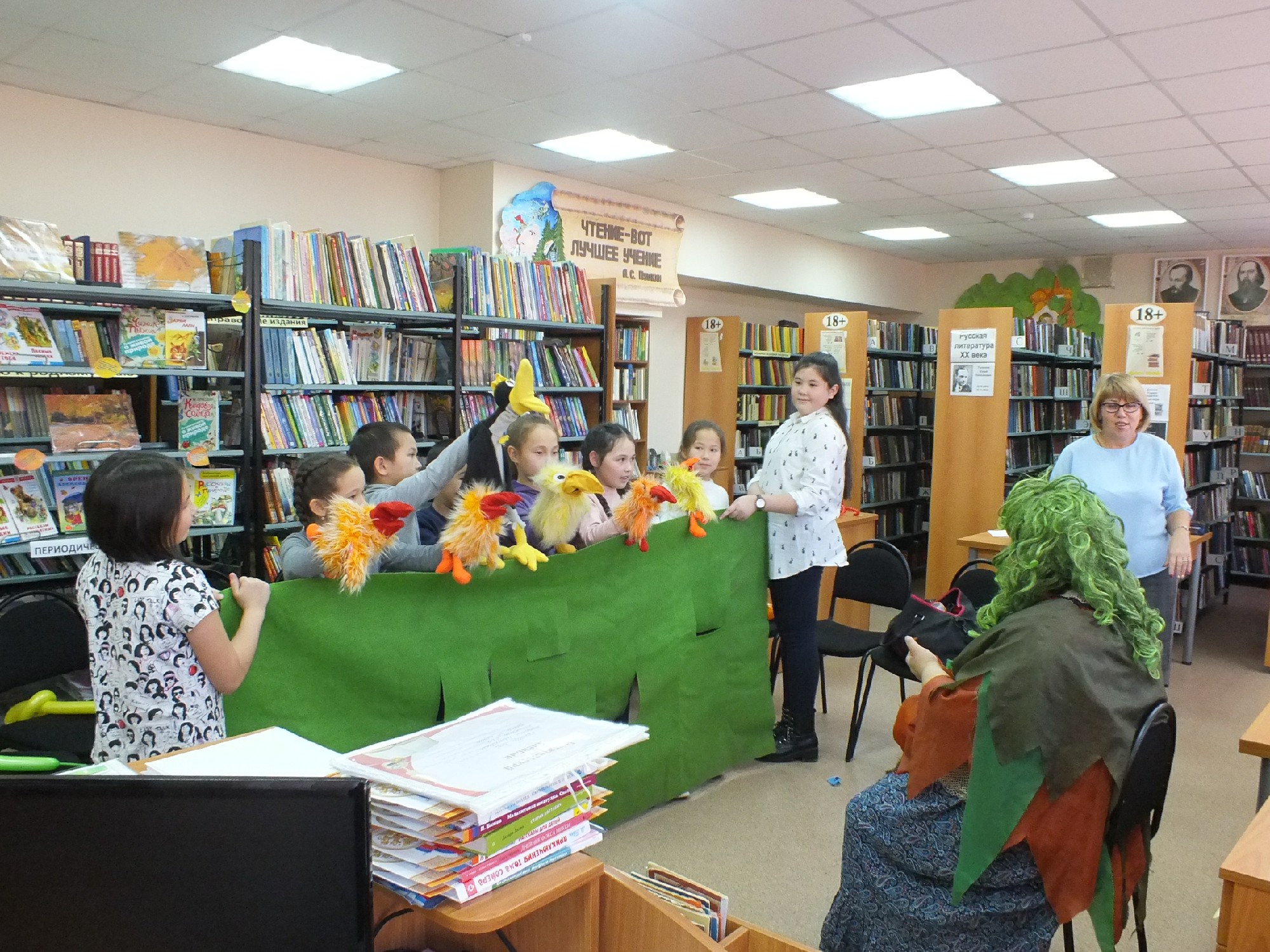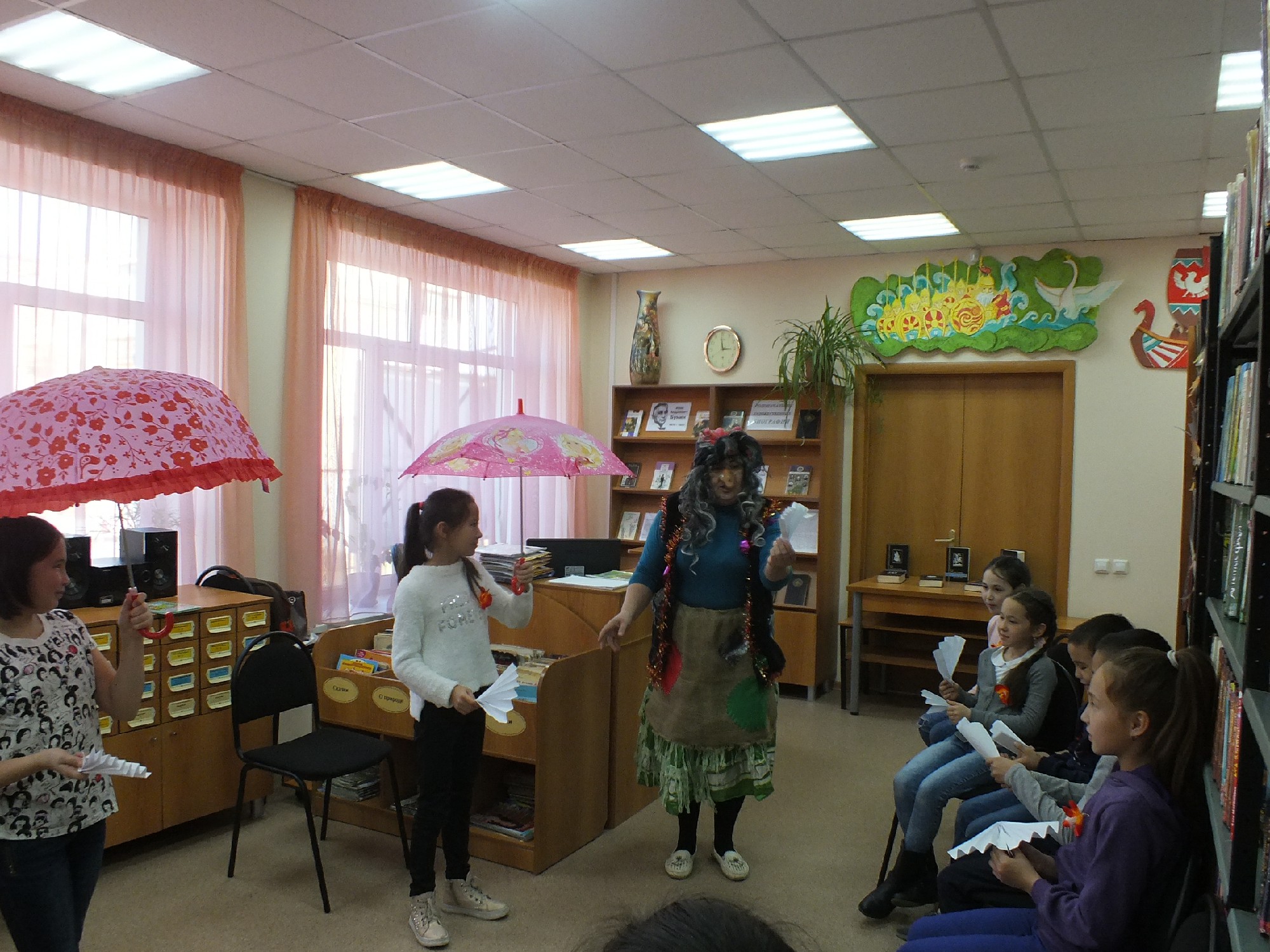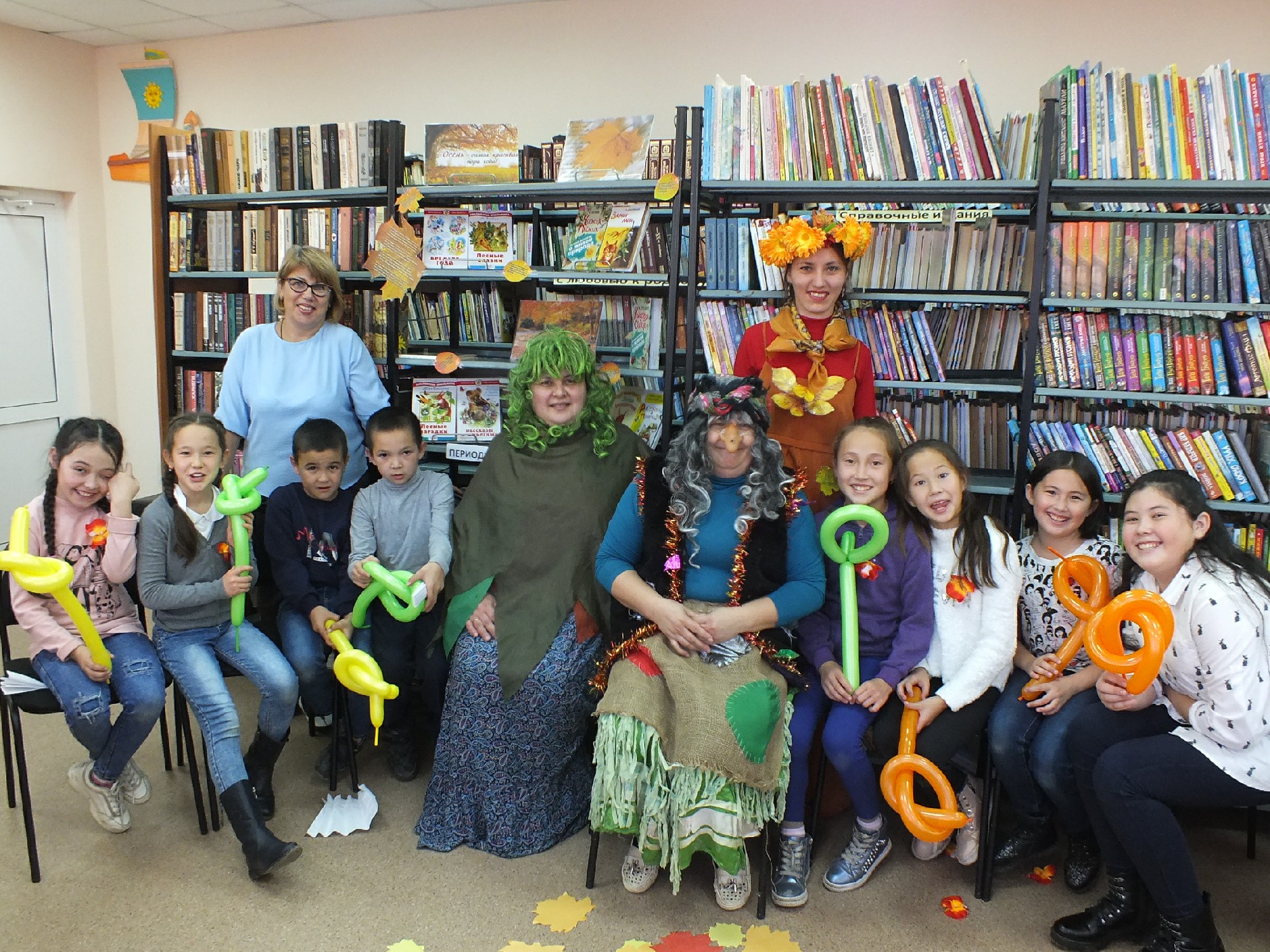 Скучать юным читателям не пришлось, ведь в гостях у детей побывали герои любимых книг, которые постарались сделать этот праздник веселым: для бабы Яги читали сказки и делали цветы из шаров в подарок «Осени», Лешего радовали выступлением кукольного театра, вместе с Осенью смастерили красивую, картину из листьев и бус.