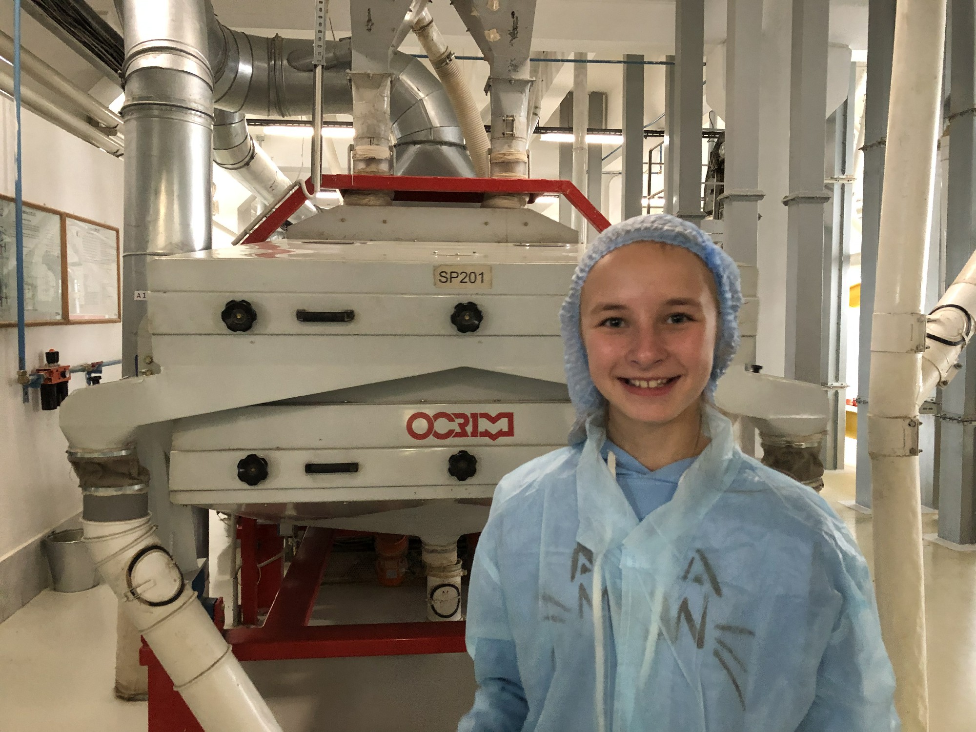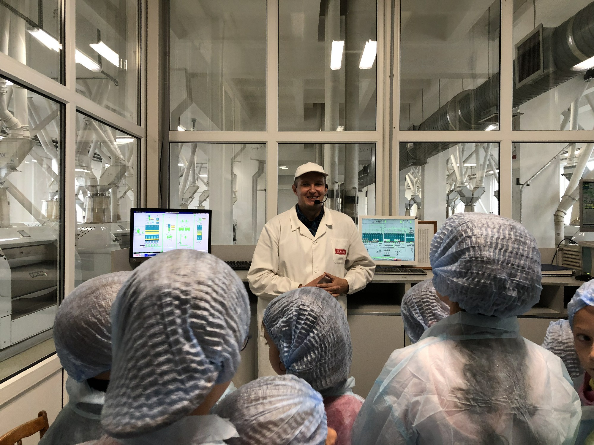 Экскурсия началась с посещения макаронной мельницы. Технолог предприятия Андрей Якунин рассказал технологический процесс производства муки макаронного помола, из которой в дальнейшем производятся макаронные изделия «MAKFA». Ребята смогли увидеть современное оборудование, на котором работают их родители.