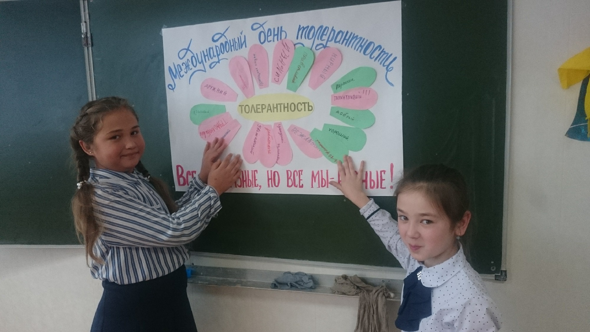 Дети узнали, что живут в многонациональной стране, учатся в многонациональной школе, где есть представиьтели 5 национальностей. И поэтому им очень важно быть толерантными – уважать других ребят, быть терпимее к иному образу жизни, поведению, обычаям, чувствам, мнениям, идеям, верованиям других ребят, быть внимательными к своим сверстникам, дружить с ними. Ведь все – мы разные, но все мы – равные!
