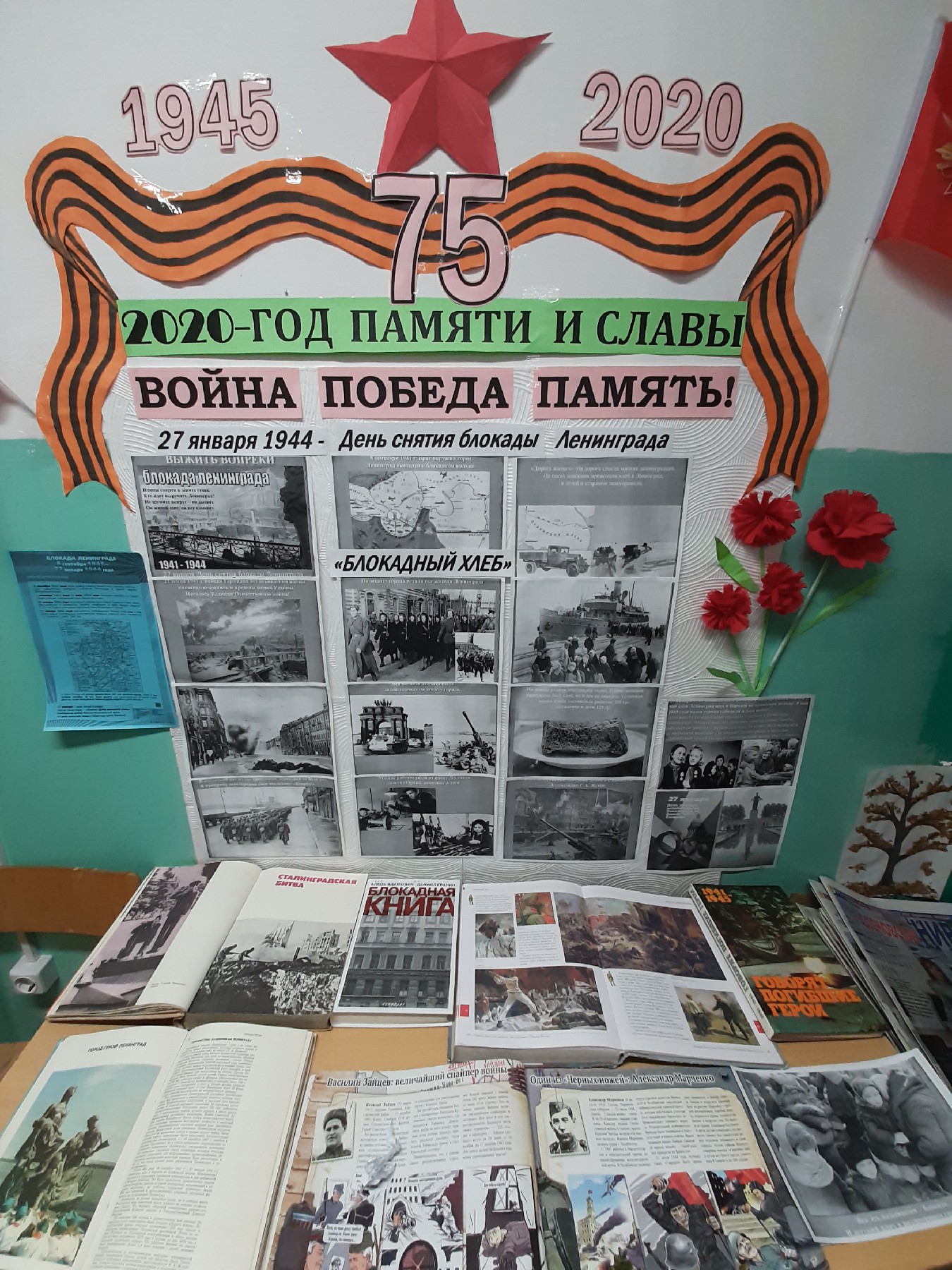 27 января 1944 года была снята блокада Ленинграда. Этой дате посвящены книжная выставка и стенд «День освобождения блокады Ленинграда «Блокадный хлеб»», которые оформлены в библиотеке д. Алишева.