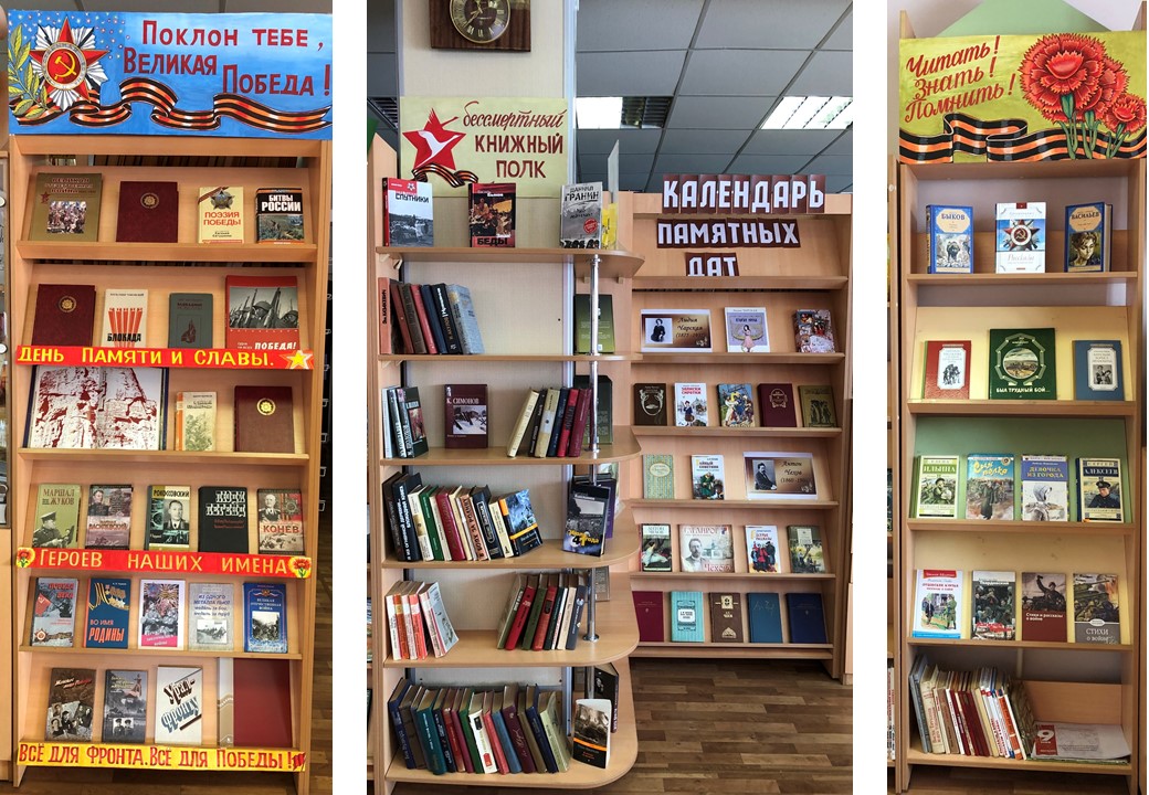 Теме Великой Отечественной Войны посвящена еще одна выставка «Бессмертный книжный полк», которая сразу же стала популярна. На выставке представлены художественные произведения о войне.