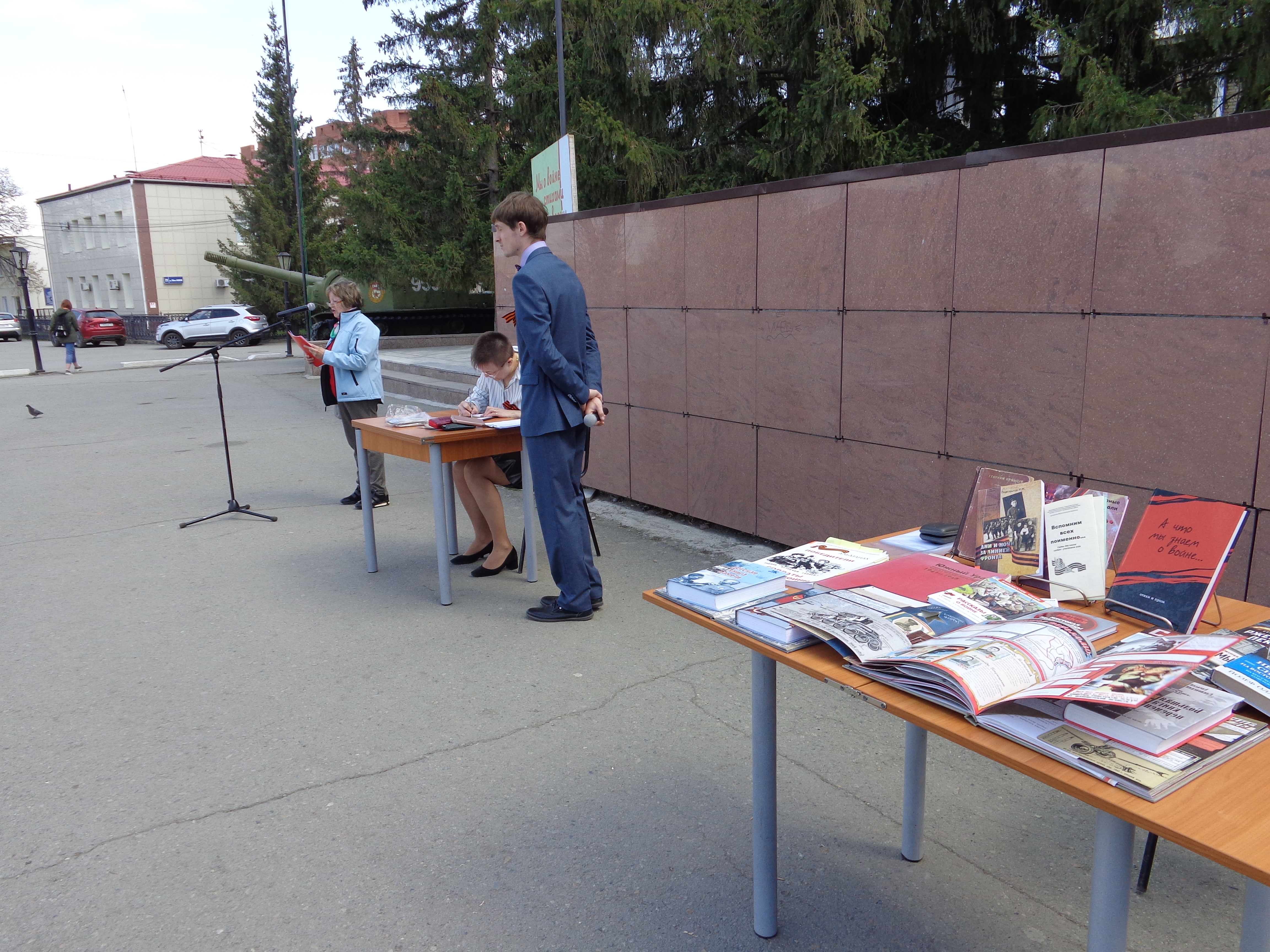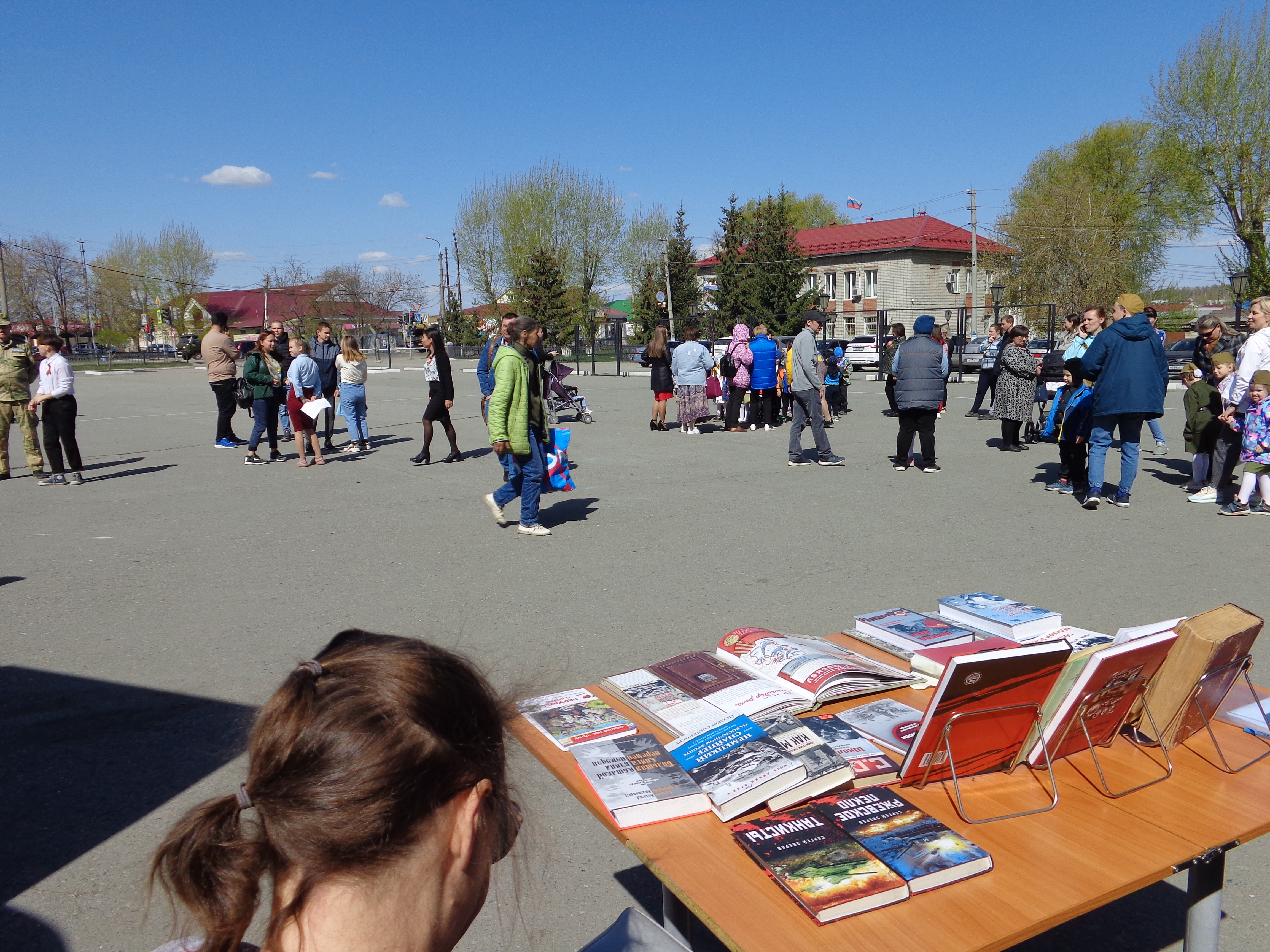 Традиционно, на площади Победы в с. Долгодеревеннское Центральная библиотека представила выставку книг, и если кто-то очень хотел поучаствовать в акции, но не помнил наизусть стихи о войне - можно было просто подойти к библиотечному столику, полистать книги, найти то, что отзовётся в сердце и прочесть с импровизированной сцены для благодарных слушателей.