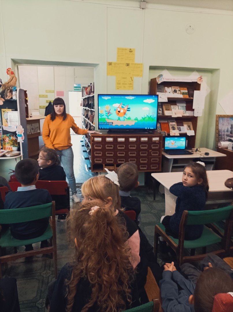 В завершение экскурсии посмотрели мультфильм Три кота "Библиотека". Ребятам очень понравилось путешествие, познавательное и интересное, и они пообещали прийти в библиотеку, чтобы взять книжки.
