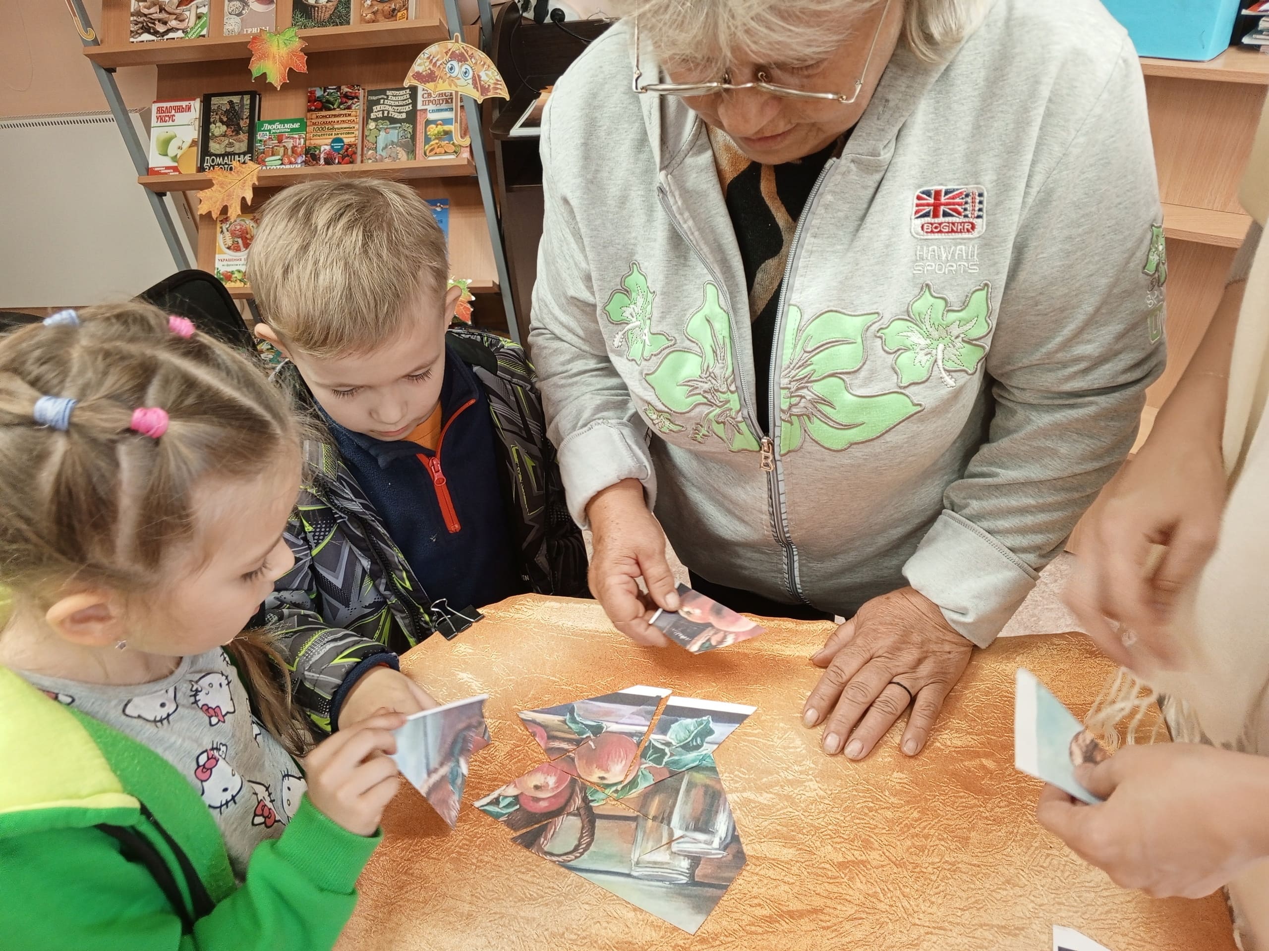 Библиотекарь Светлана Александровна подготовила для взрослых кино-викторину "Угадай фильм по одному кадру", а ребятишки с удовольствием поиграли в игру "Что лишнее?". А затем мы собирали осенний натюрморт из пазлов.
