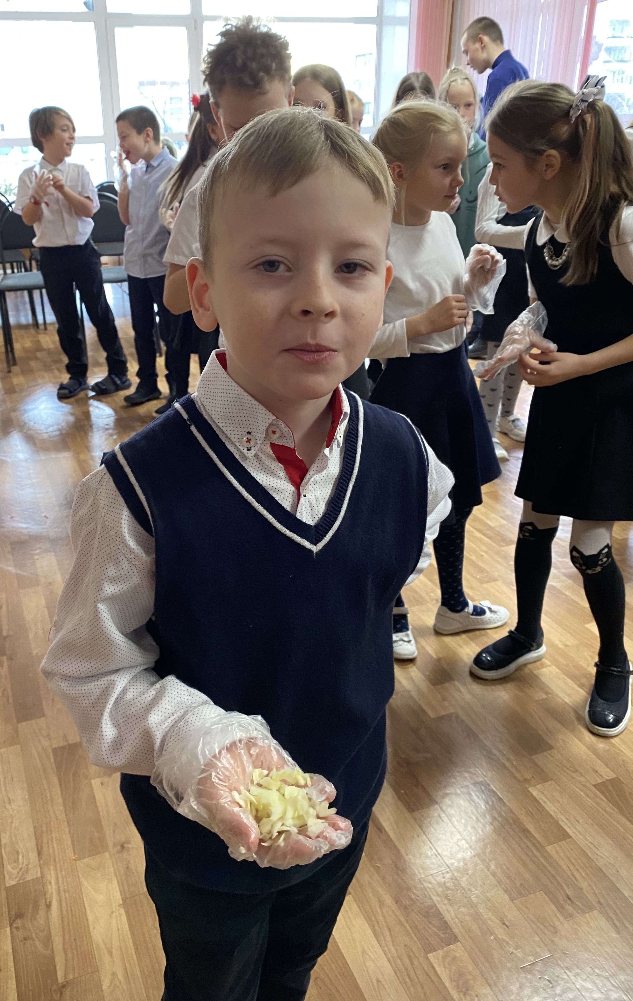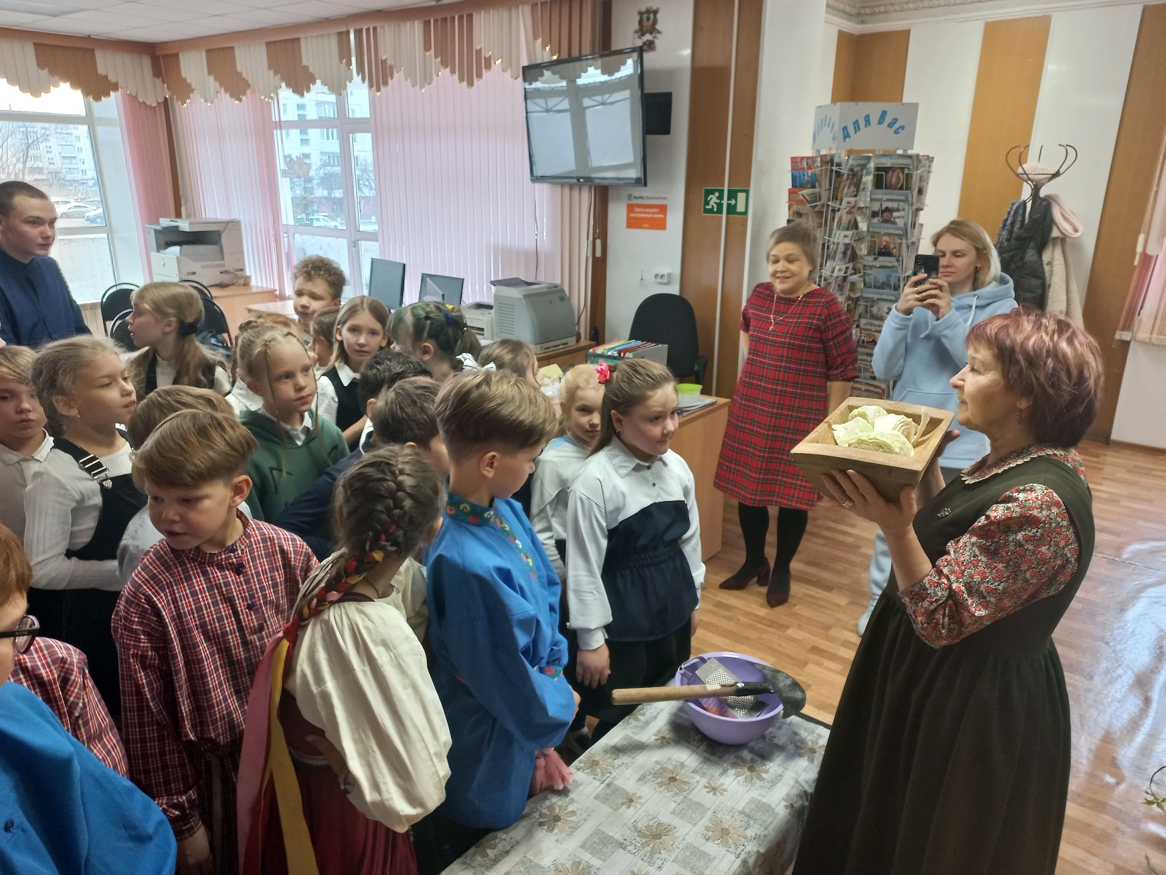Ребята познакомились с осенними народными праздниками, поговорили о старинных обычаях русского народа, поучаствовали в кулинарном мастер - классе по засолке капусты. Рецептом со второклассниками поделилась Любовь Павловна Шмакова - руководитель фольклорного ансамбля "Вереюшка". Она показала детям, как правильно солить капусту, а все присутствующие с удовольствием ей помогали: рубили капусту, шинковали морковь, солили. Капуста выдалась на славу!
