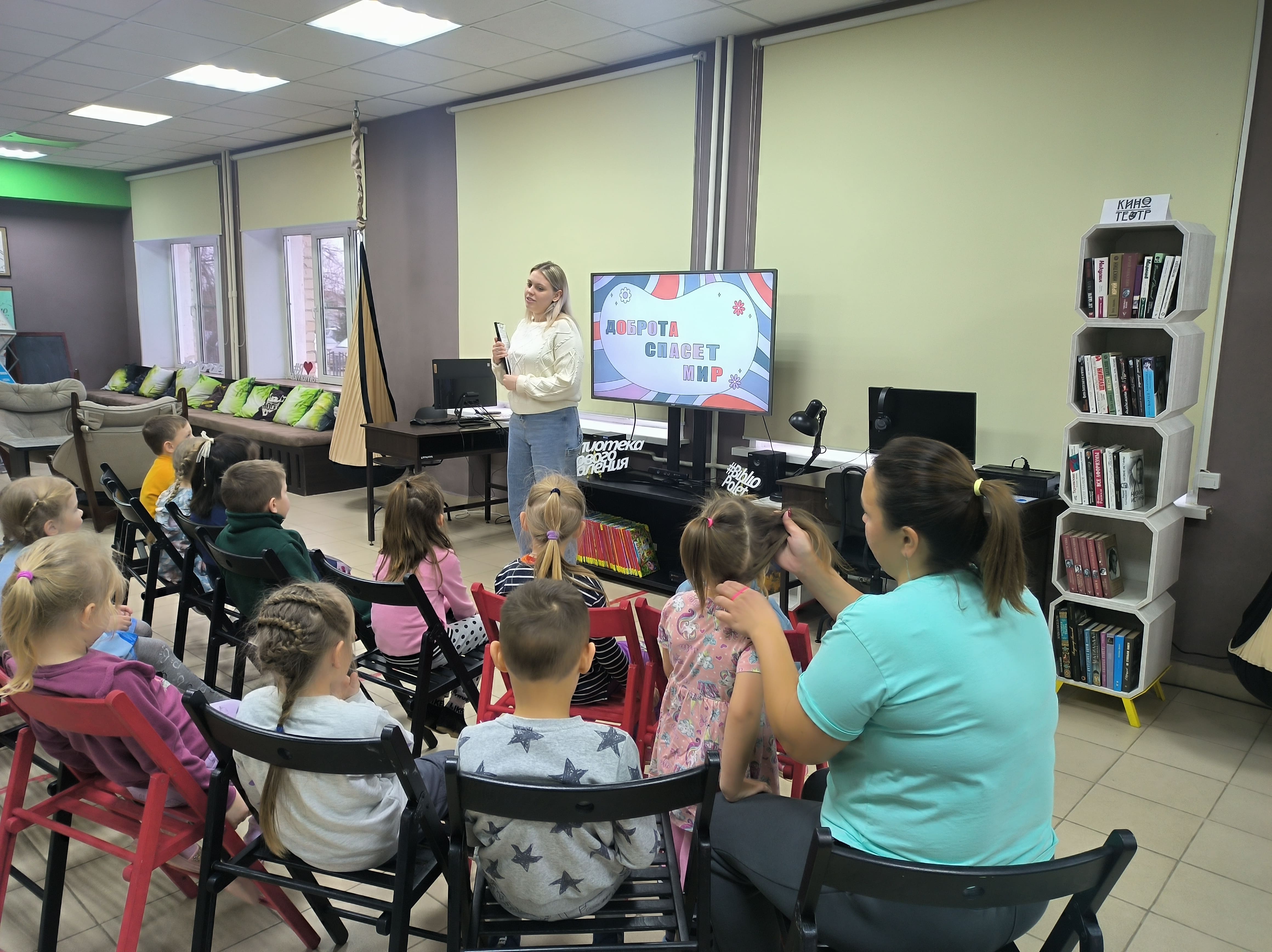 Ребята обсудили с библиотекарем такую важную тему как "добрые дела" и для чего их совершать; посмотрели фрагменты советских мультфильмов с песенками о доброте "Хорошо бродить по свету" и "Если добрый ты". Чтобы поделиться своим добром с окружающими, дети сыграли в игру "Цепочка добра", в которой им нужно было сказать добрые слова сидящему рядом товарищу.