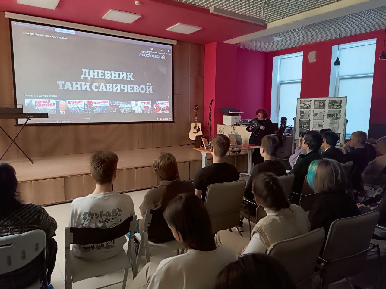 Ровно 872 дня Ленинград жил отрезанный от всего внешнего мира, соединённый с большой землёй "дорогой жизни". Видеохроника отчётливо передала весь трагизм того времени, тот масштаб бедствия, который обрушился на нашу страну. Во время беседы учащимся были продемонстрированы книги, отразившие массовый героизм жителей блокадного города, процитированы дневники очевидцев блокады, в том числе знаменитые записки Тани Савичевой.