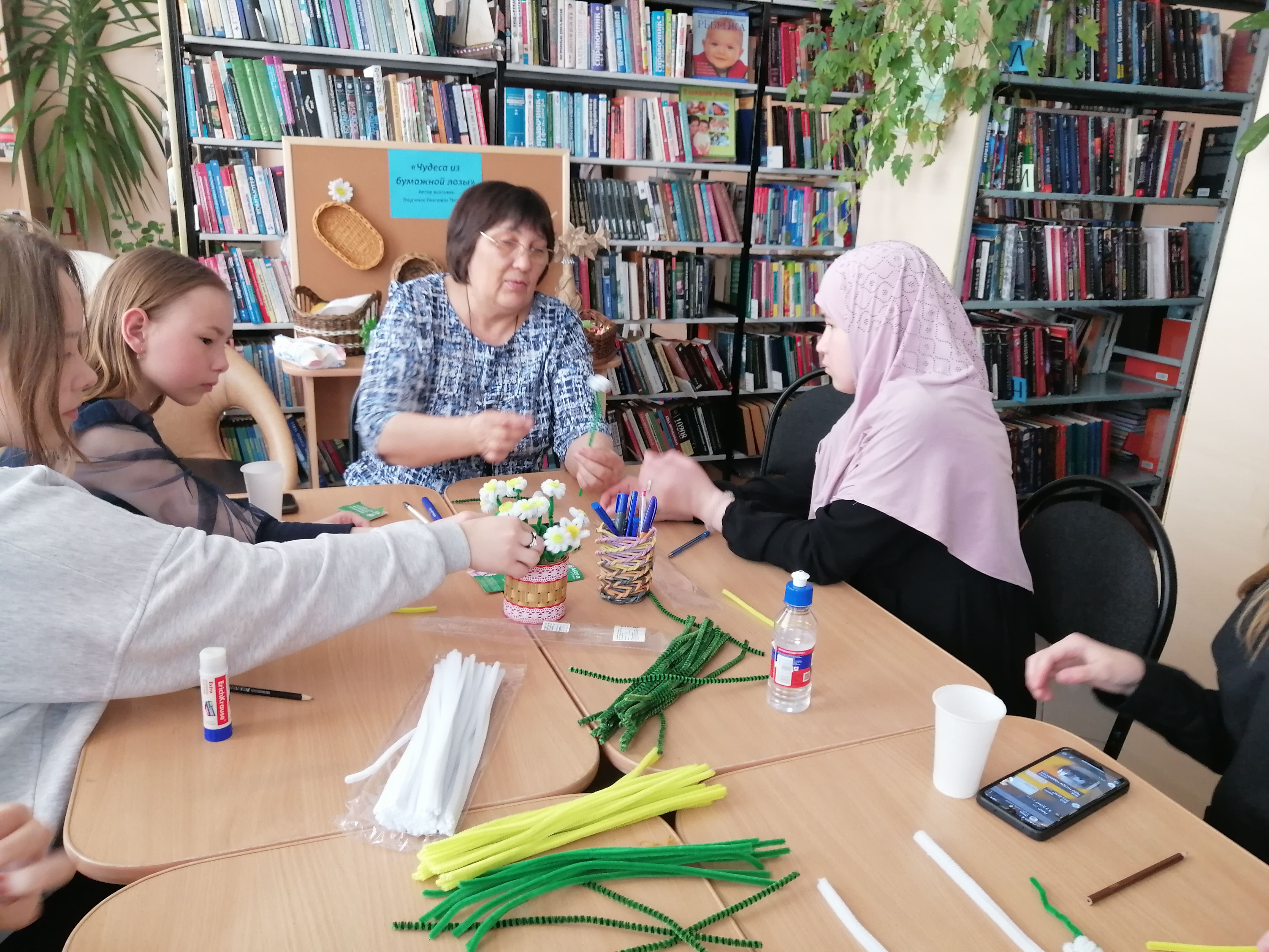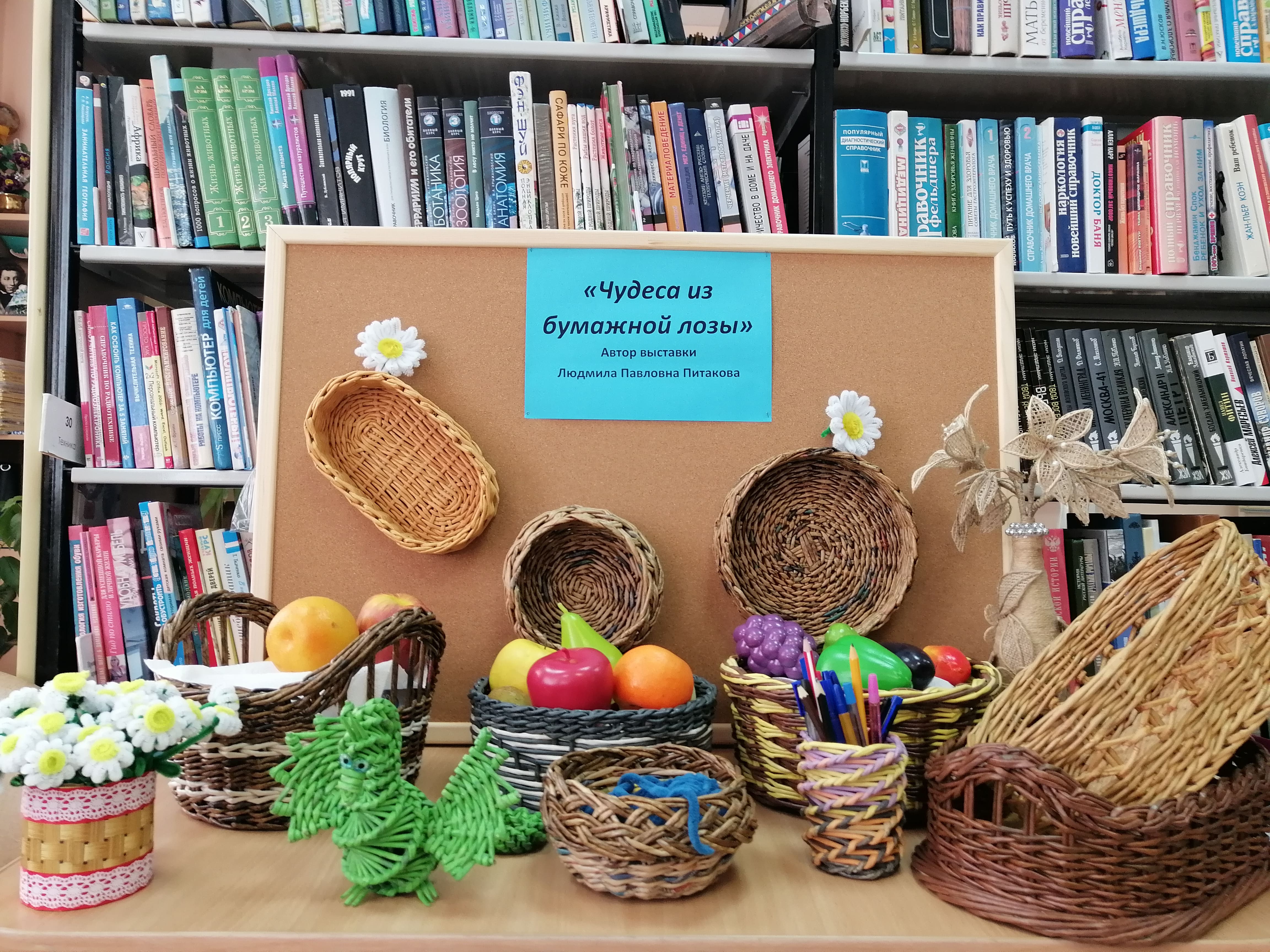 В этот день для читателей в библиотеки открылась выставка "Чудеса из бумажной лозы". Здесь представлены работы – Людмилы Павловны Питаковой.