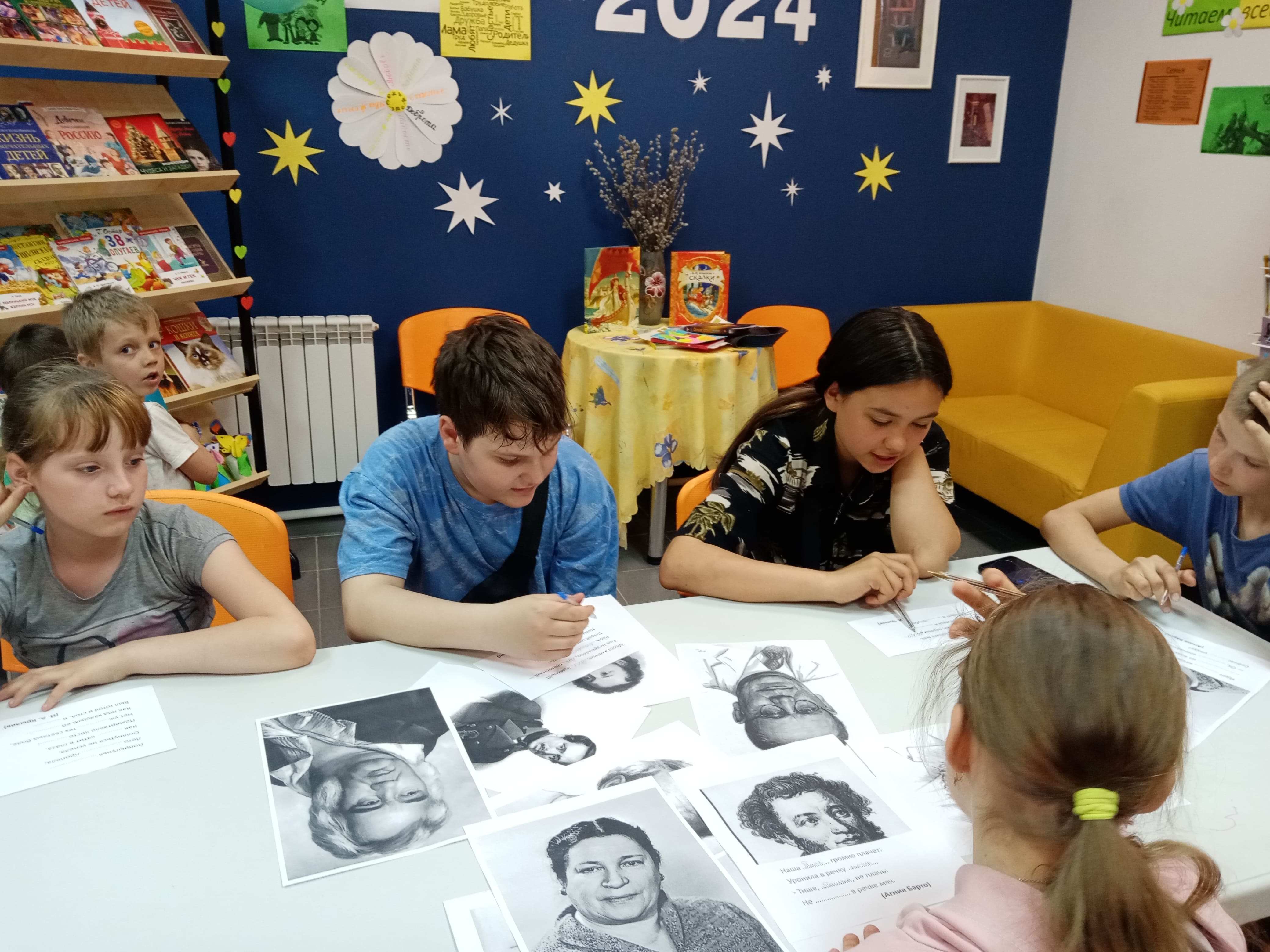 Присутствующие приняли участие, и успешно справились с викториной "Угадай поэта", где нужно было вставить недостающие слова в отрывки из стихотворений, а затем найти портрет автора. Продолжилась программа конкурсом "Весёлый клоун". Разделившись на две команды, ребята на листке бумаги рисовали по очереди названого им персонажа. Получались очень смешные рисунки. Для желающих был проведён мастер-класс по изготовлению поделки к Пасхе. Для гостей библиотеки были организованы: книжная выставка и фотозона "Читаем всей семьёй".