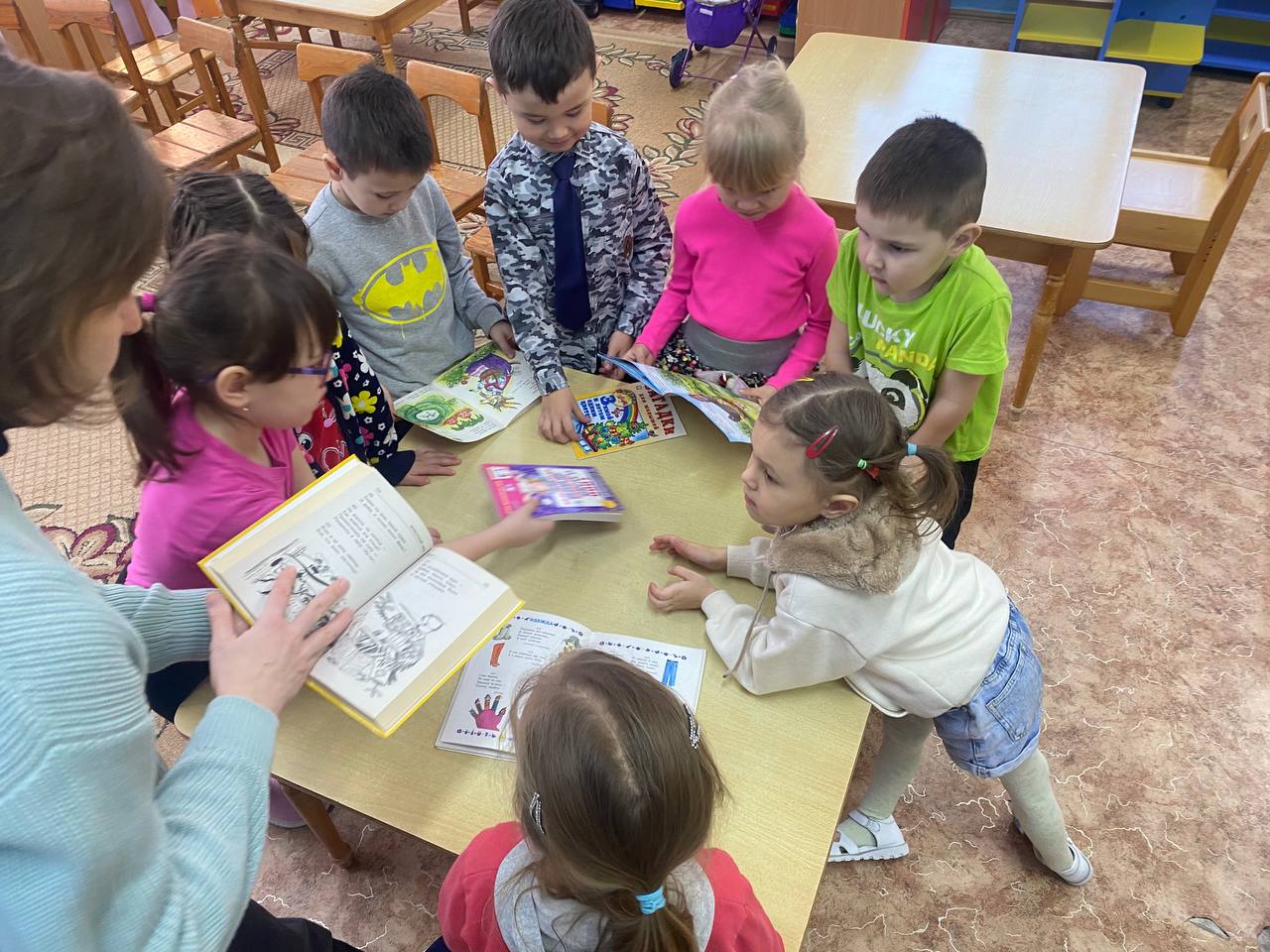 В заключение все с интересом рассматривали книги, принесённые библиотекарем. Кто умеет читать-читал, кто-то рассматривал картинки-отгадки. А кто-то очень живо и артистично сам придумывал свои истории по картинкам.