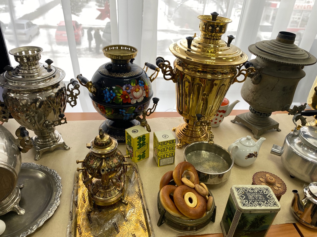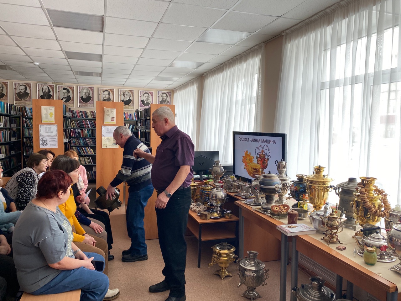 Коллекцию самоваров представил односельчанам в библиотеке Алексей Ханжин. Он рассказал об истории появления самоваров на Руси, особенностях их устройства и традиции чаепития, которым и завершилась наша интересная встреча.