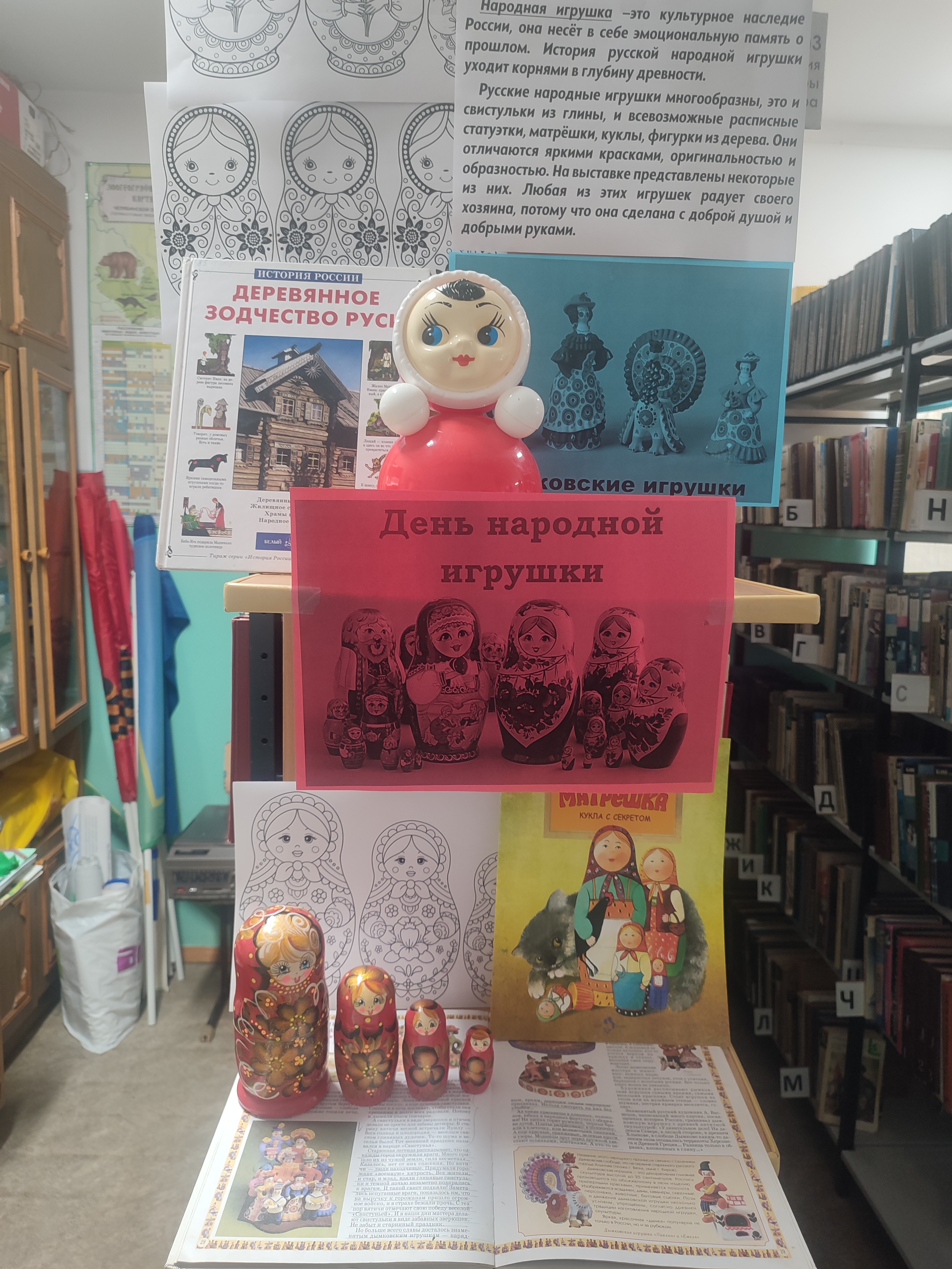 24 августа в России отмечается День народной игрушки. К этому дню в библиотеке д.Алишева оформлена выставка-инсталляция «День народных игрушек».
