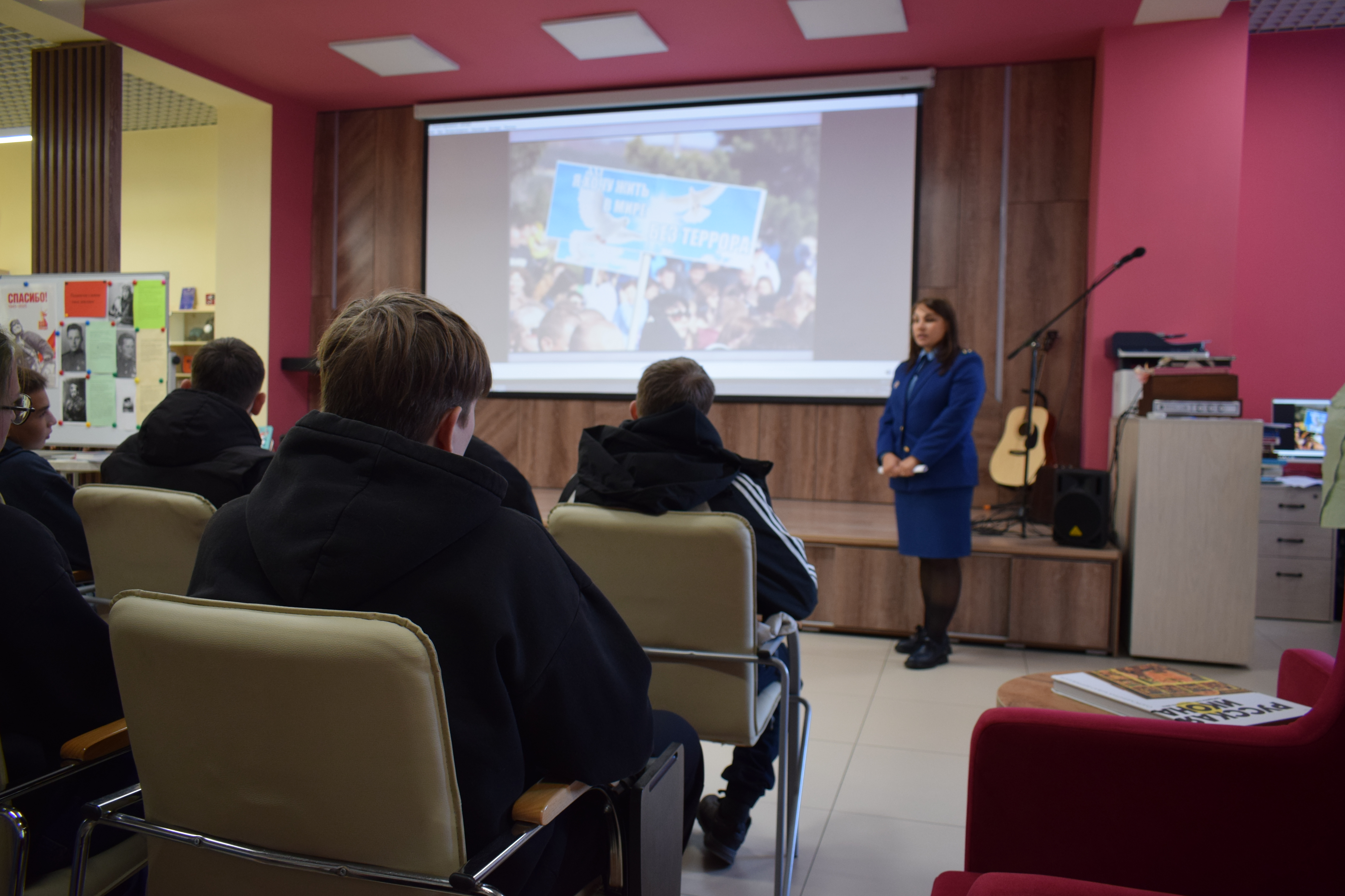 17 сентября 2025 г. в стенах Центральной библиотеки состоялась встреча помощника прокурора Сосновского района Марии Евгеньевны Нацентовой со студентами ГБОУ «Аргаяшский Аграрный техникум» отделение с. Долгодеревенского по теме: «Скажем терроризму -нет!».