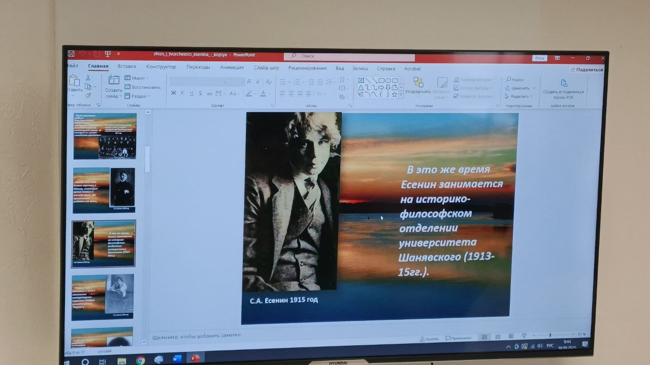 Ученики 8 класса просмотрели презентацию, познакомились с интересными фактами биографии из жизни поэта. Есенин был большим и смелым мастером стиха. Поэт непревзойденного лирического дара, которого по праву называют народным поэтом. . Его стихи о родном крае, о любви, о России известны каждому со школьной скамьи, многие из них положены на музыку и обрели новую жизнь в качестве любимых всеми песен и романсов.